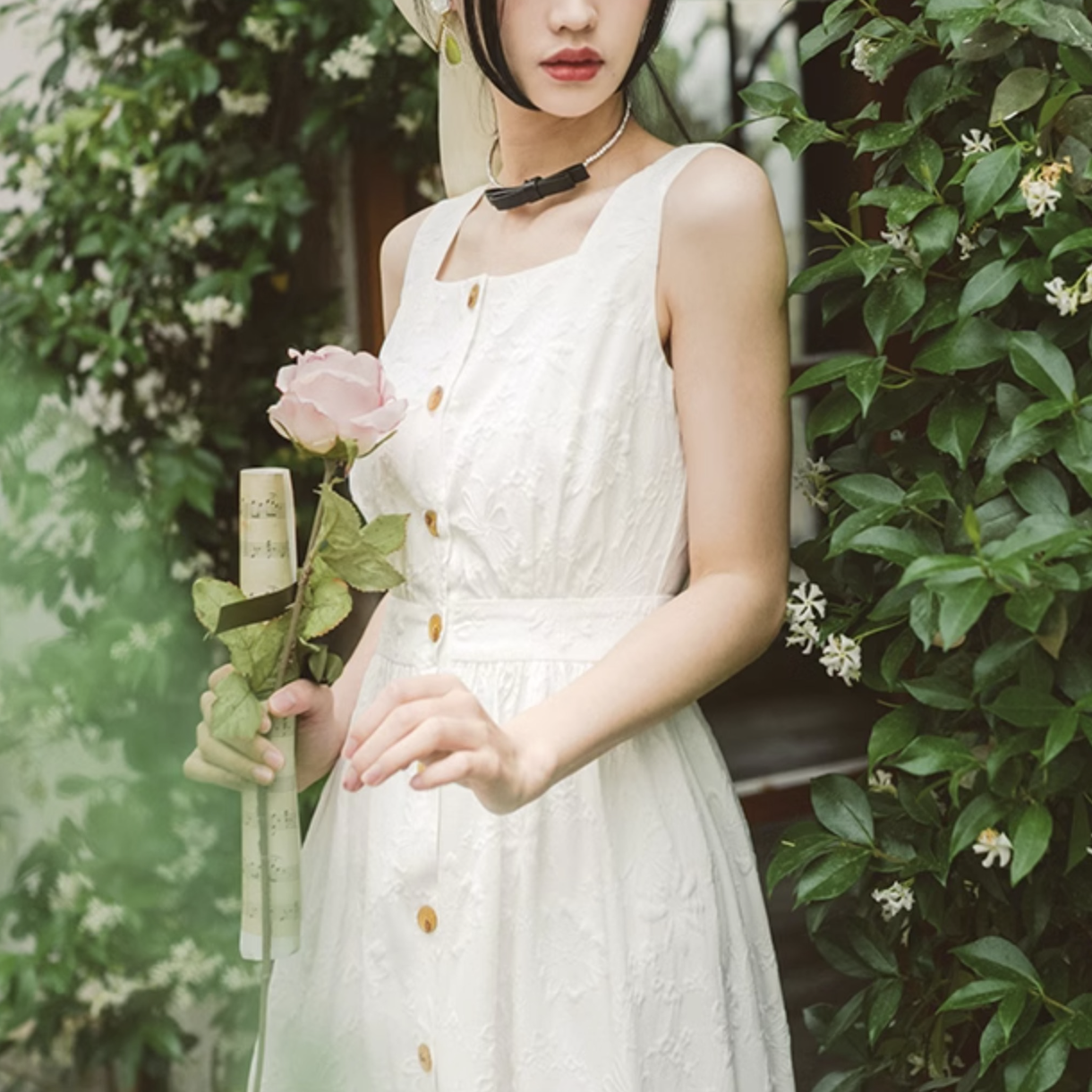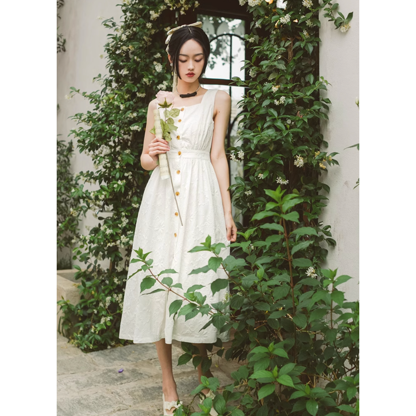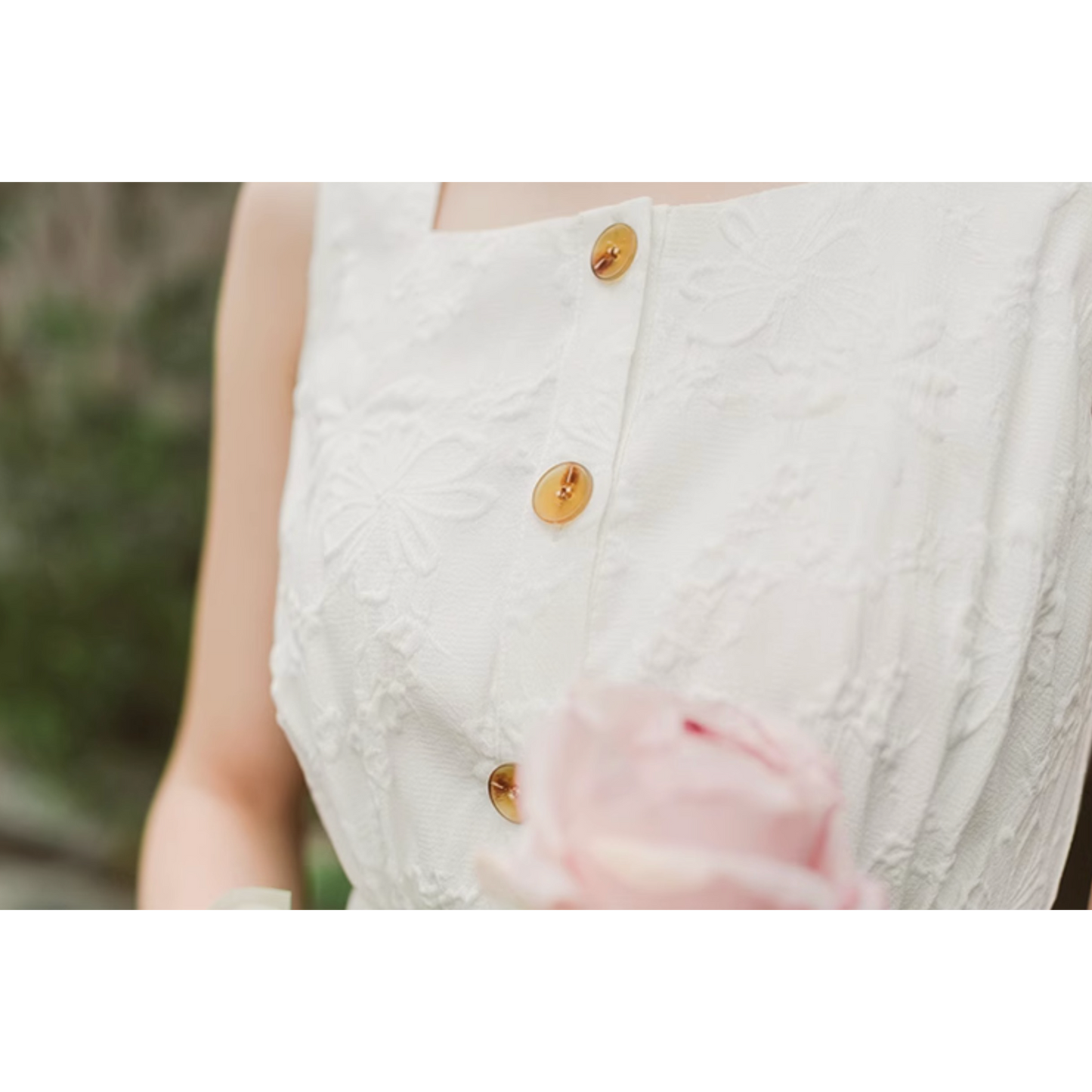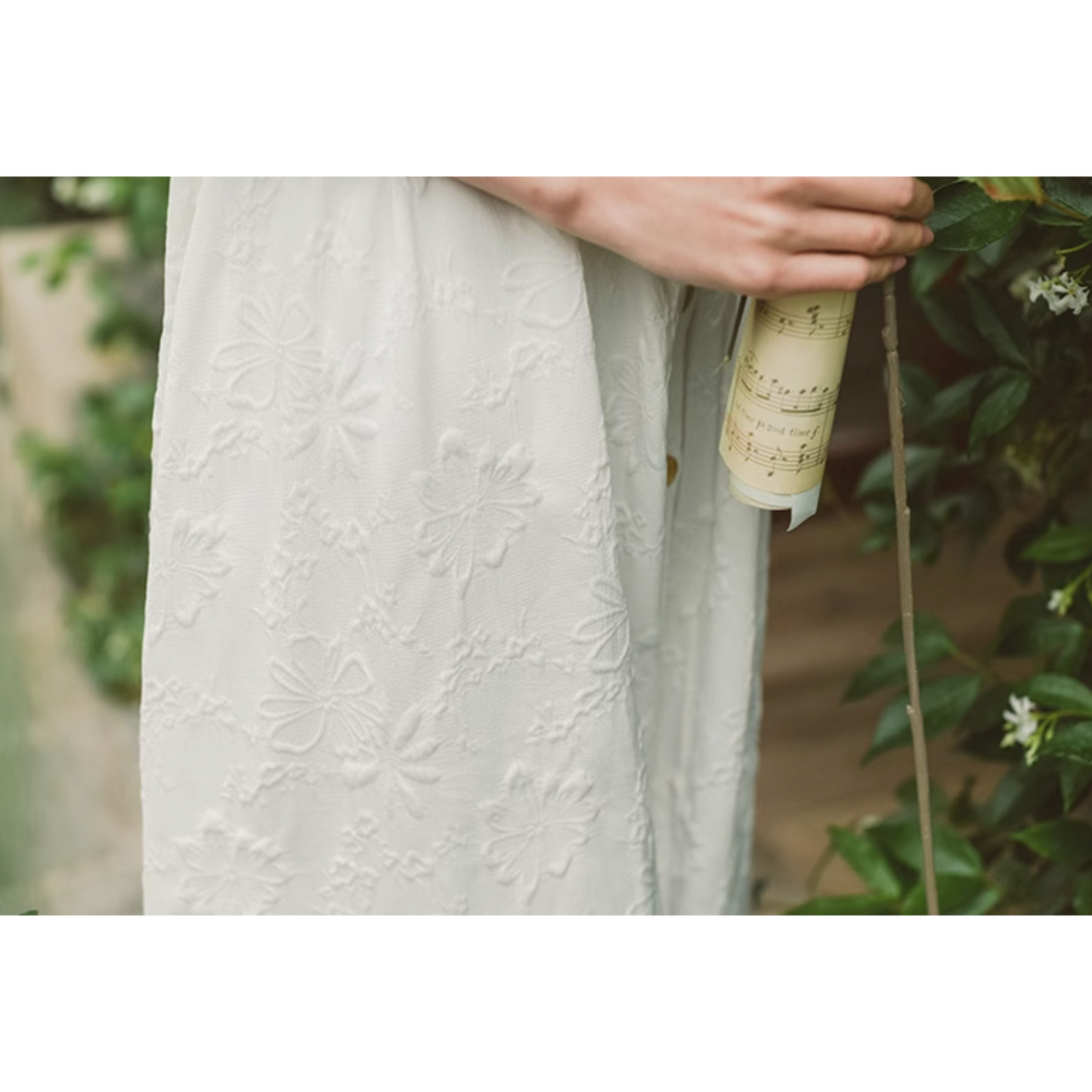 いつの間にか知らない庭園に迷い込んでしまった少女のようなワンピース。純真無垢な心を表しているようなホワイトの生地には、たくさんの花々が浮かび上がるようにあしらわれています。ノースリーブでも清楚さと気品のあるアイテムです。