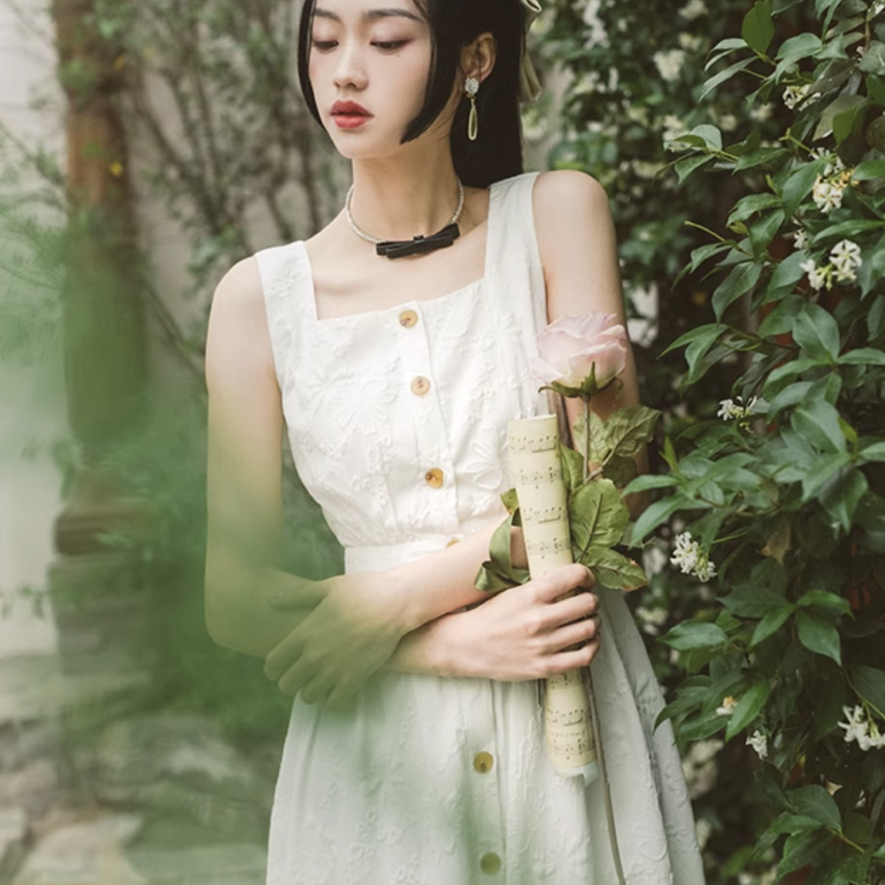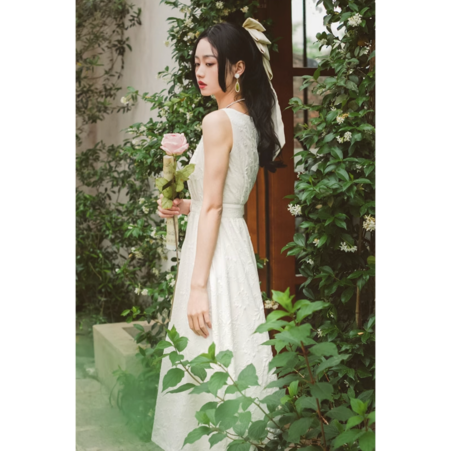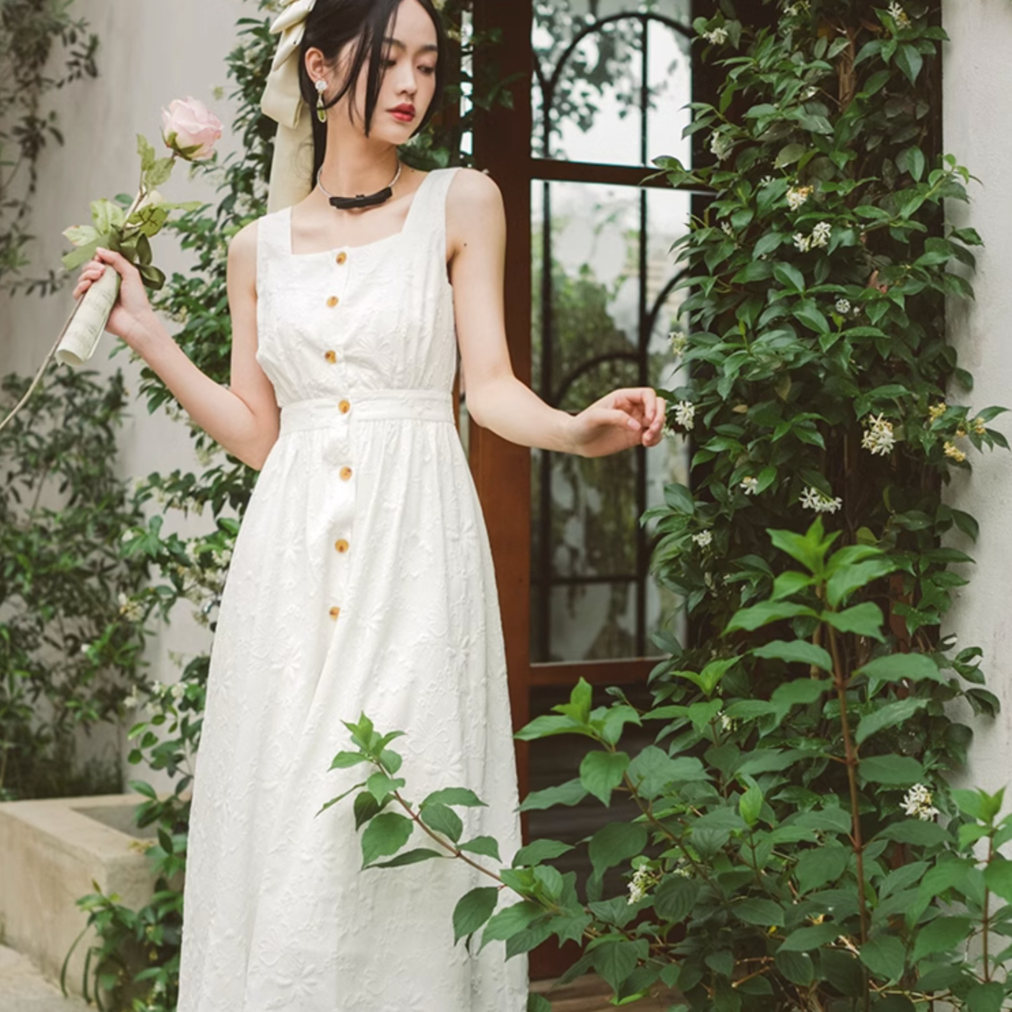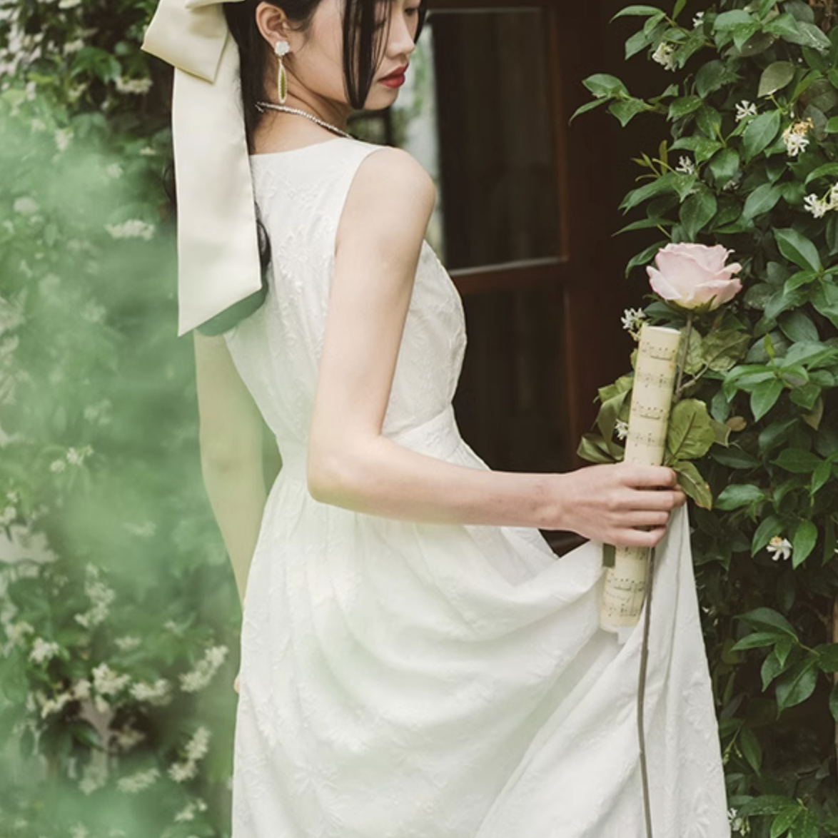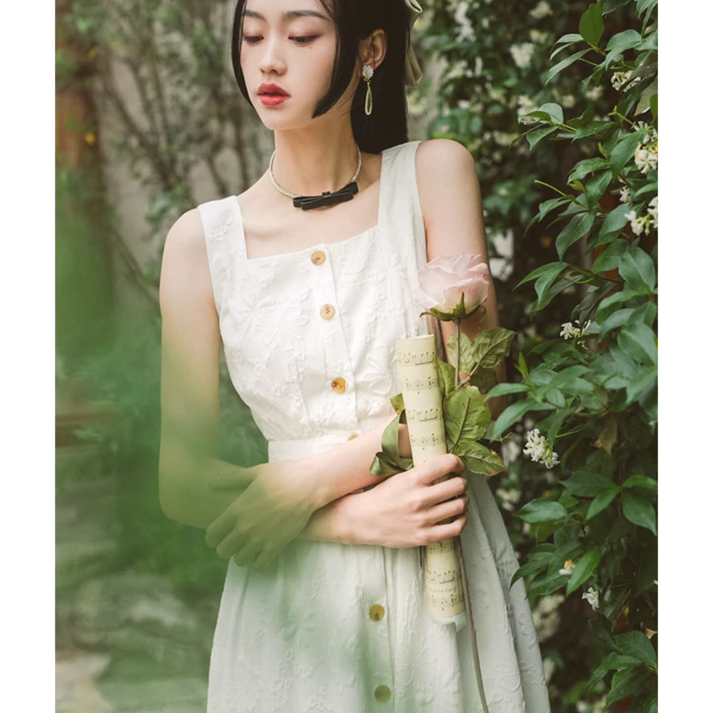 いつの間にか知らない庭園に迷い込んでしまった少女のようなワンピース。純真無垢な心を表しているようなホワイトの生地には、たくさんの花々が浮かび上がるようにあしらわれています。ノースリーブでも清楚さと気品のあるアイテムです。