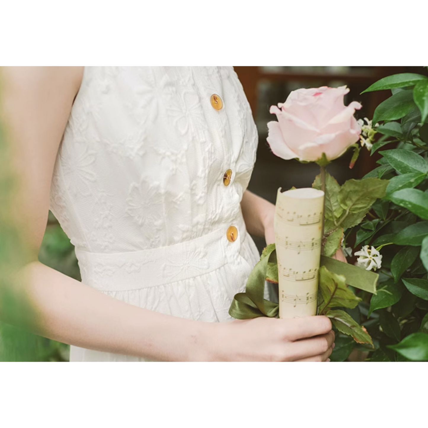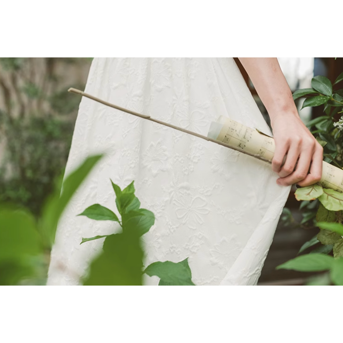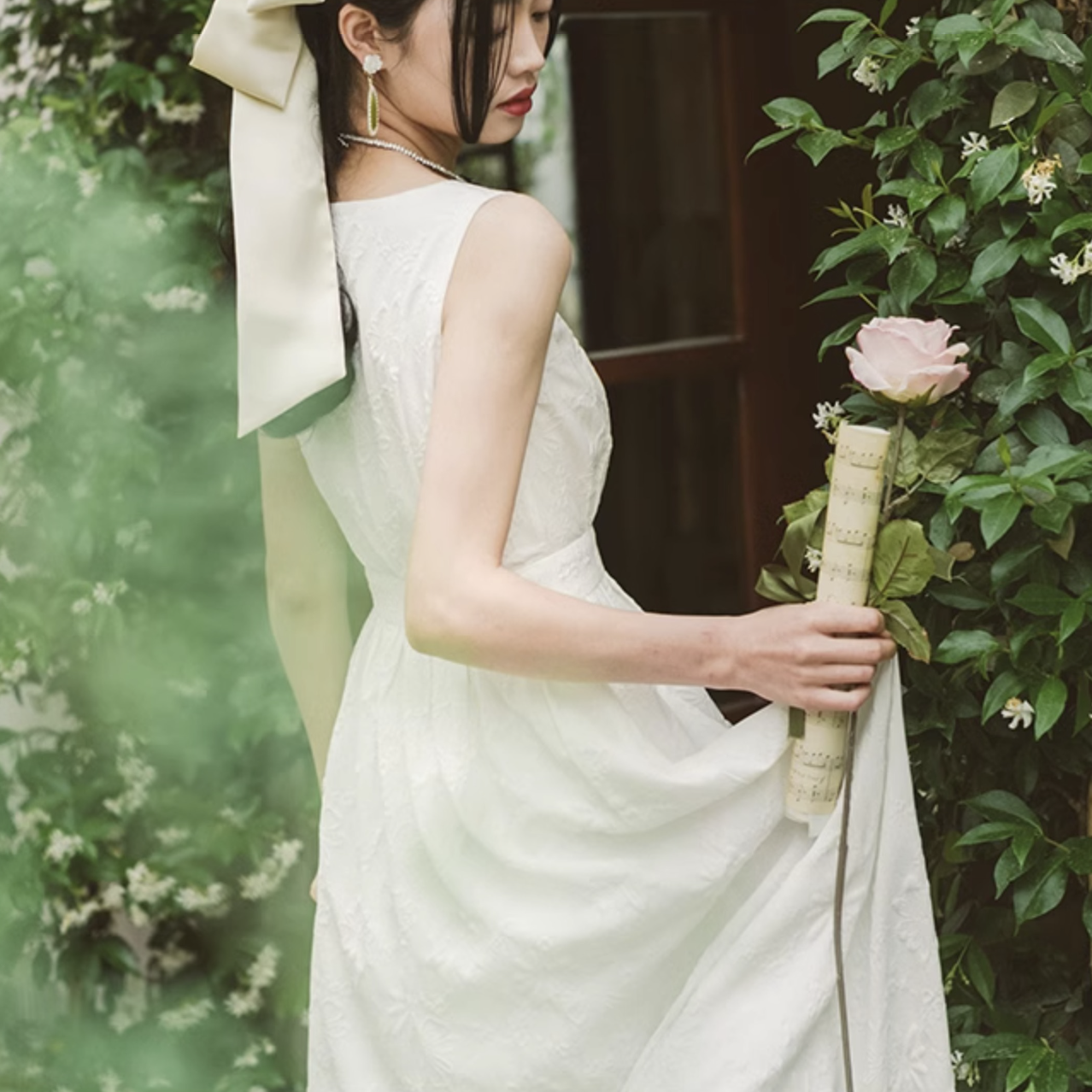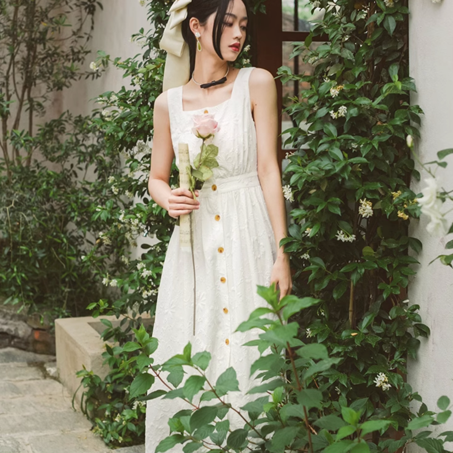 いつの間にか知らない庭園に迷い込んでしまった少女のようなワンピース。純真無垢な心を表しているようなホワイトの生地には、たくさんの花々が浮かび上がるようにあしらわれています。ノースリーブでも清楚さと気品のあるアイテムです。
