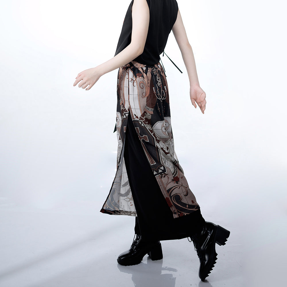 日が落ちた戌の刻、うっすらと夜の月明かりに照らされる教会のステンドガラス。ガラスの前ではカラスが荒々しく羽を鳴らし、薔薇が花びらを散らします。その妖異な時をデザインに閉じ込めました。絵柄を存分に楽しめるワイドシルエットとスリットが魅力的。