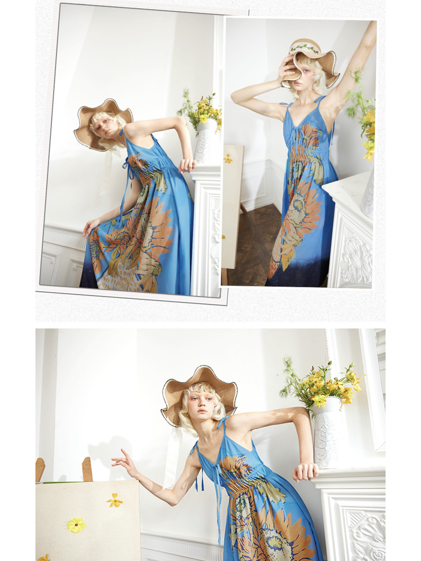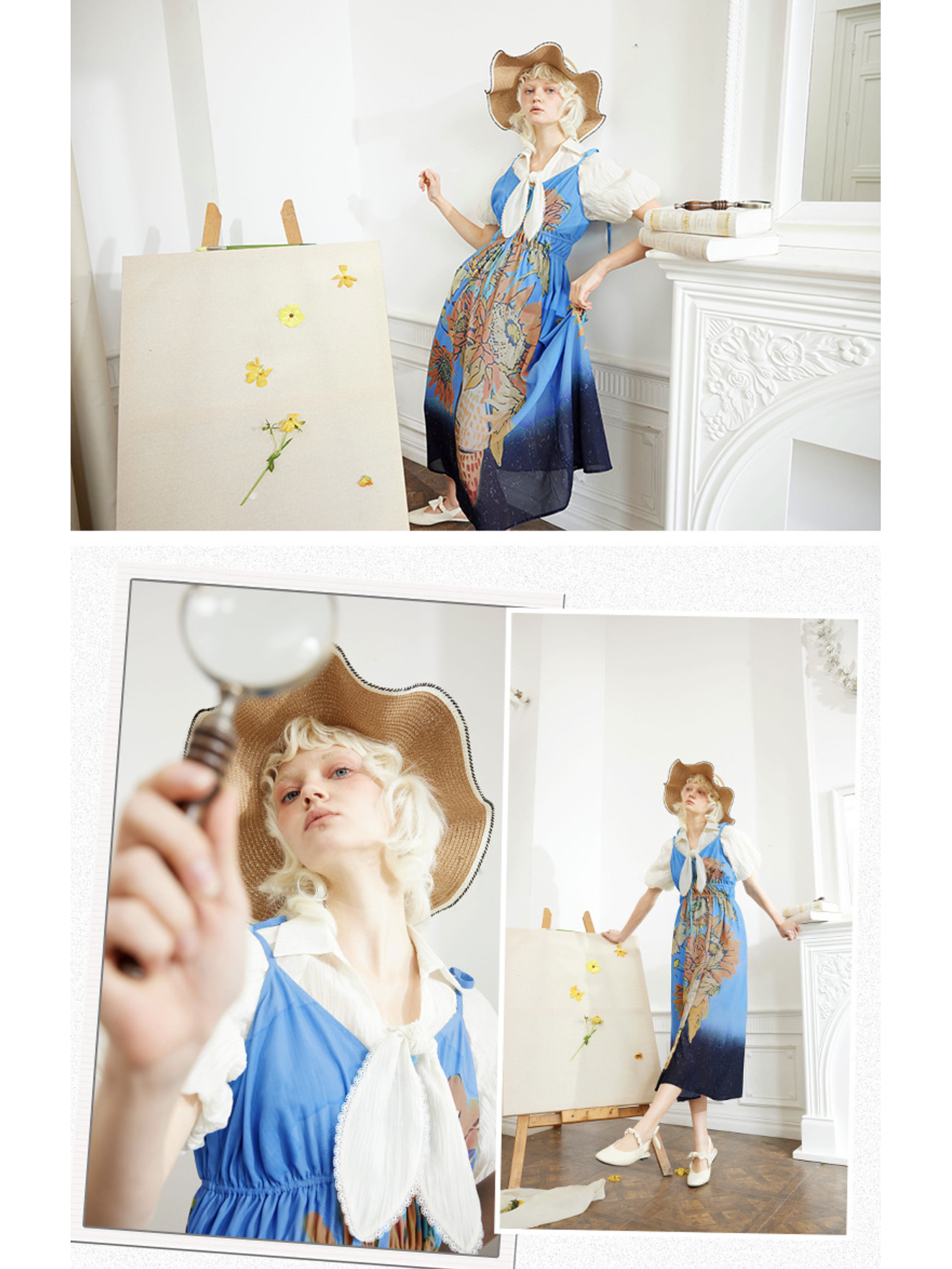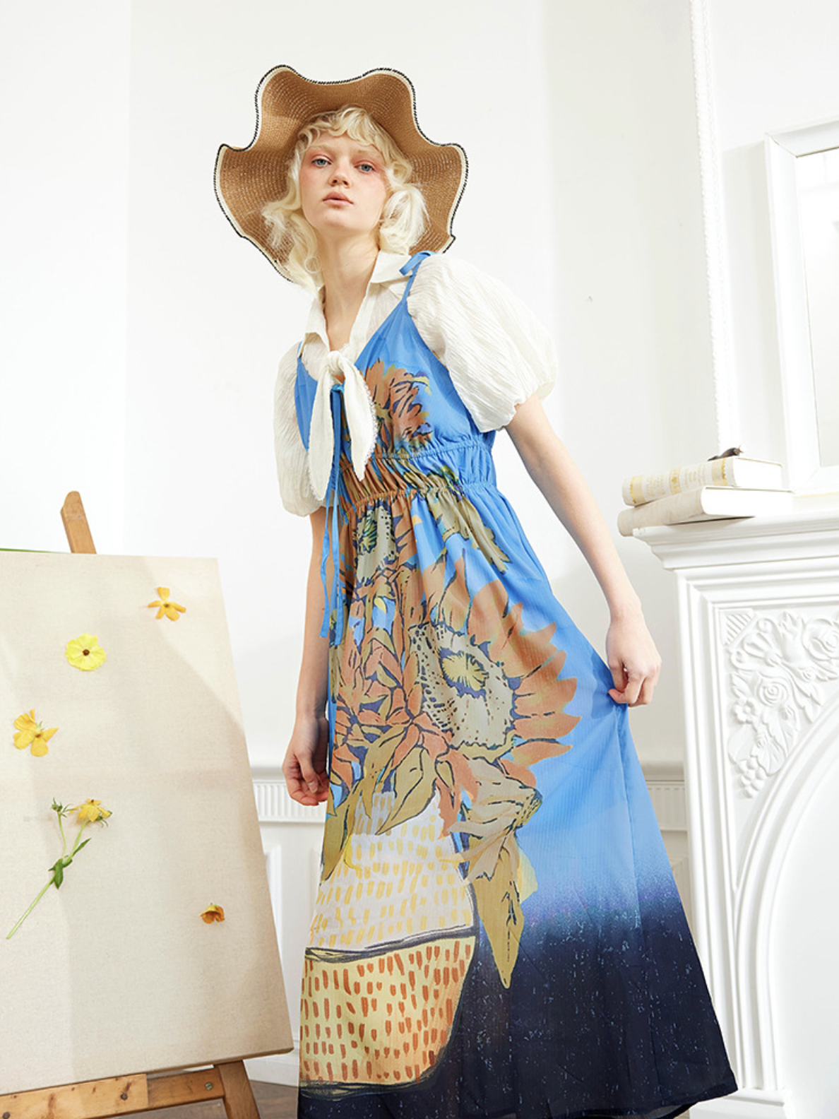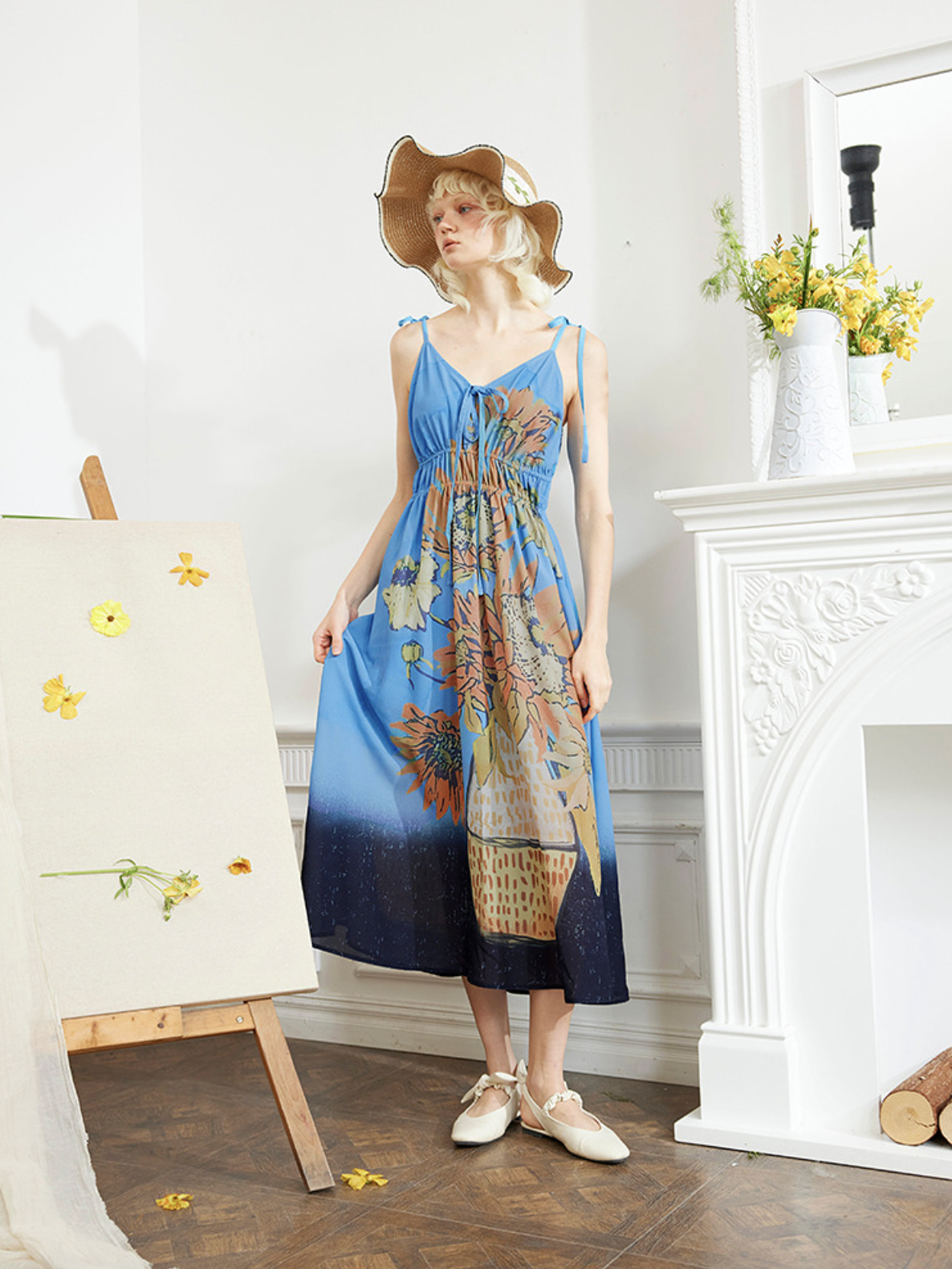 ゴッホの名画が描かれたストラップワンピース。ブルーには『花瓶の向日葵』、ストローイエローには『テオへの手紙』がデザインされている。夏の休暇を思わせる緩やかなシルエットになっており、1枚でさらりと纏ってもトップスとレイヤードしても美しい。