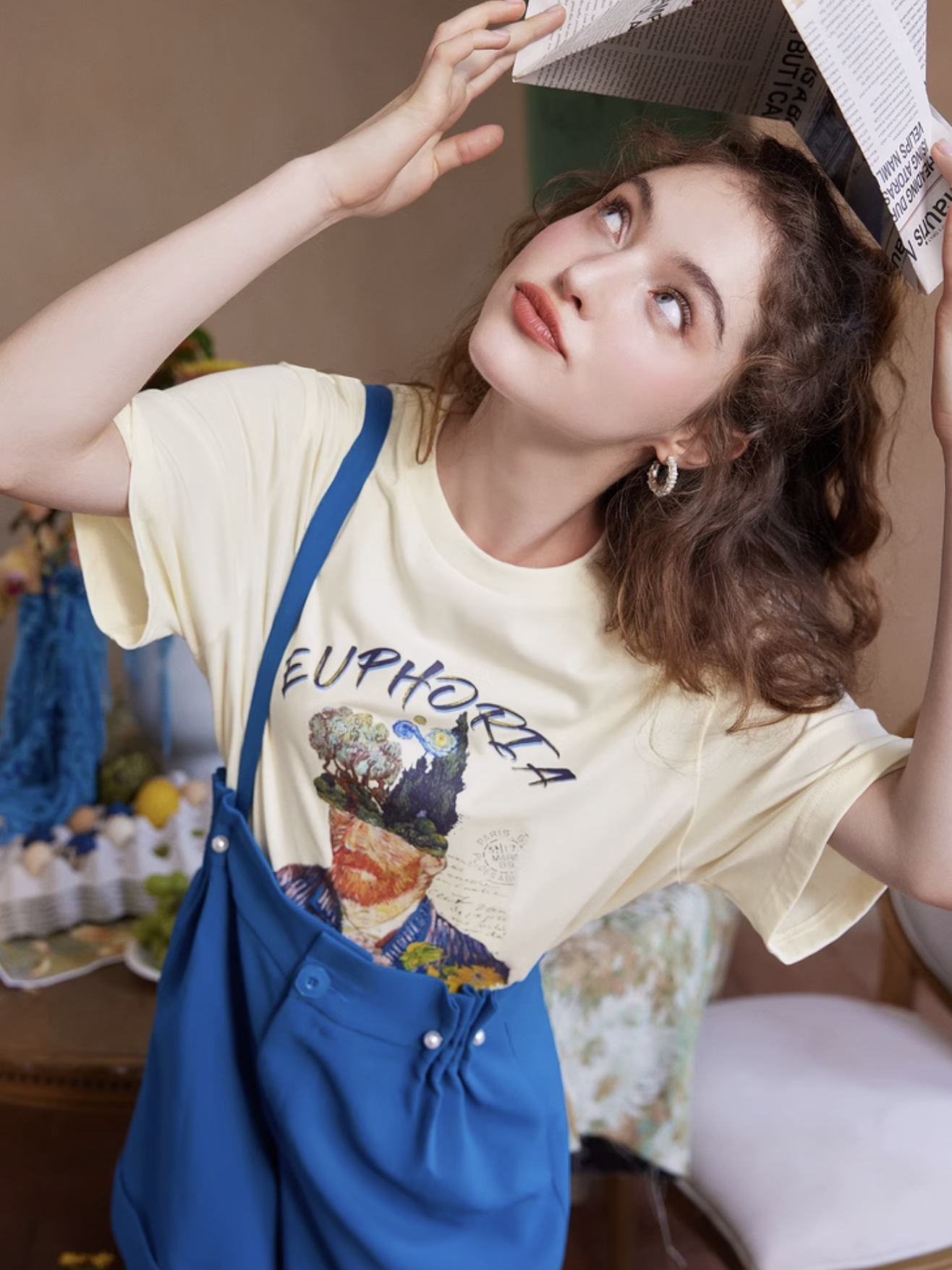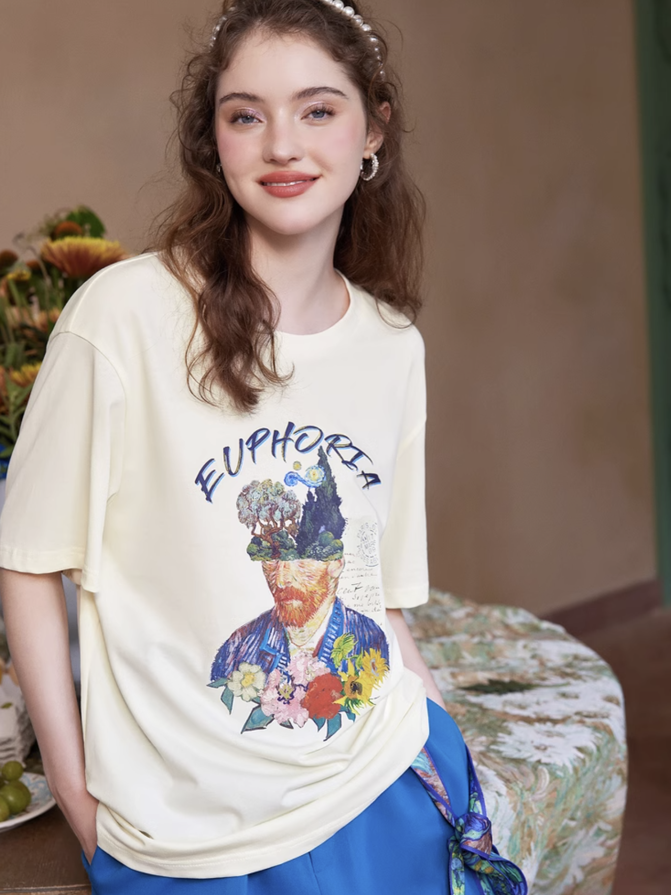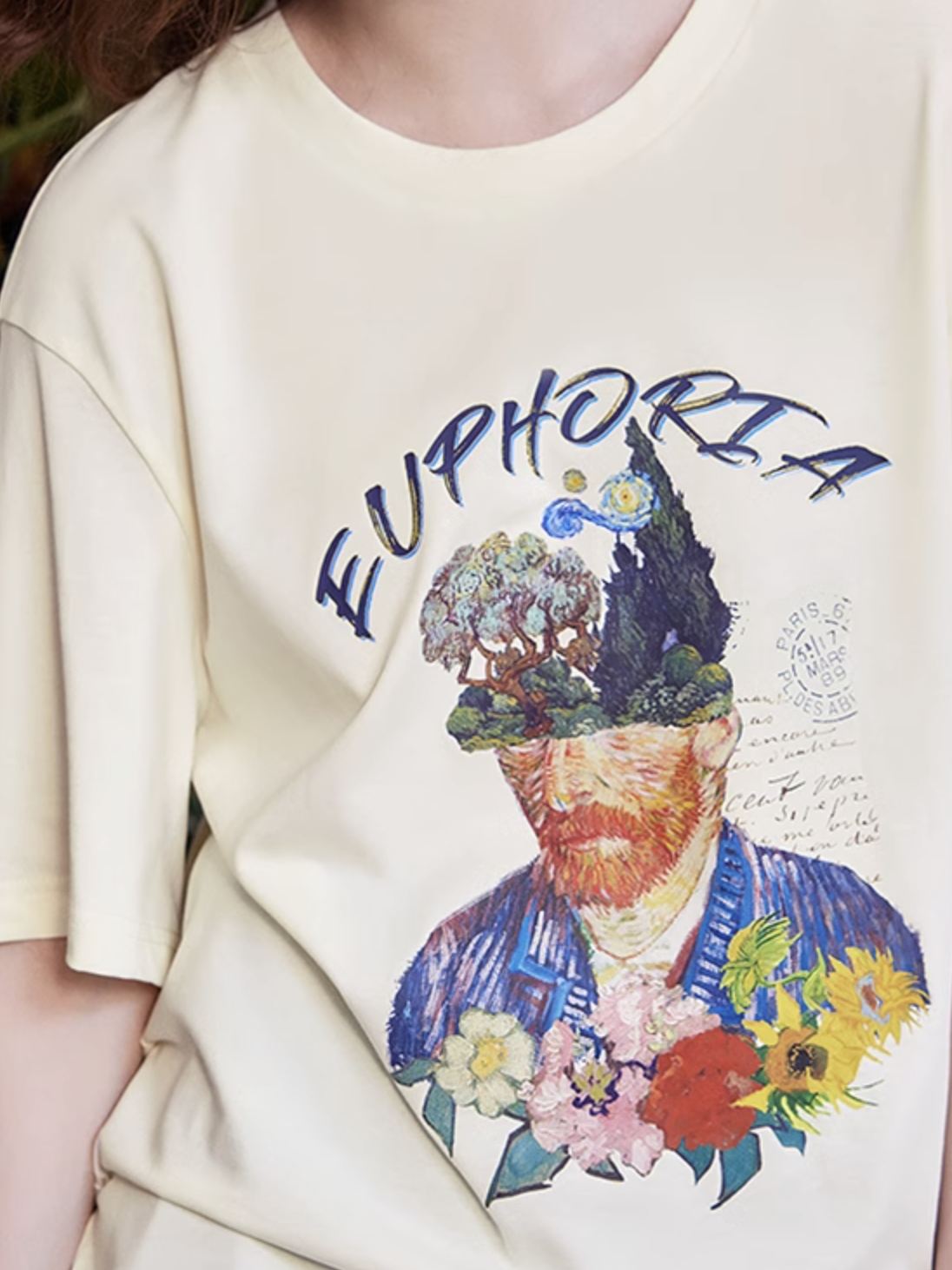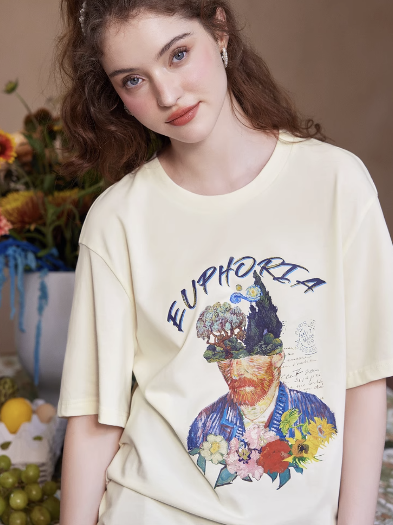 ゴッホの自画像と、ゴッホが描いた美しき花々や、群青色の星月夜を組み合わせたコラージュTシャツ。
