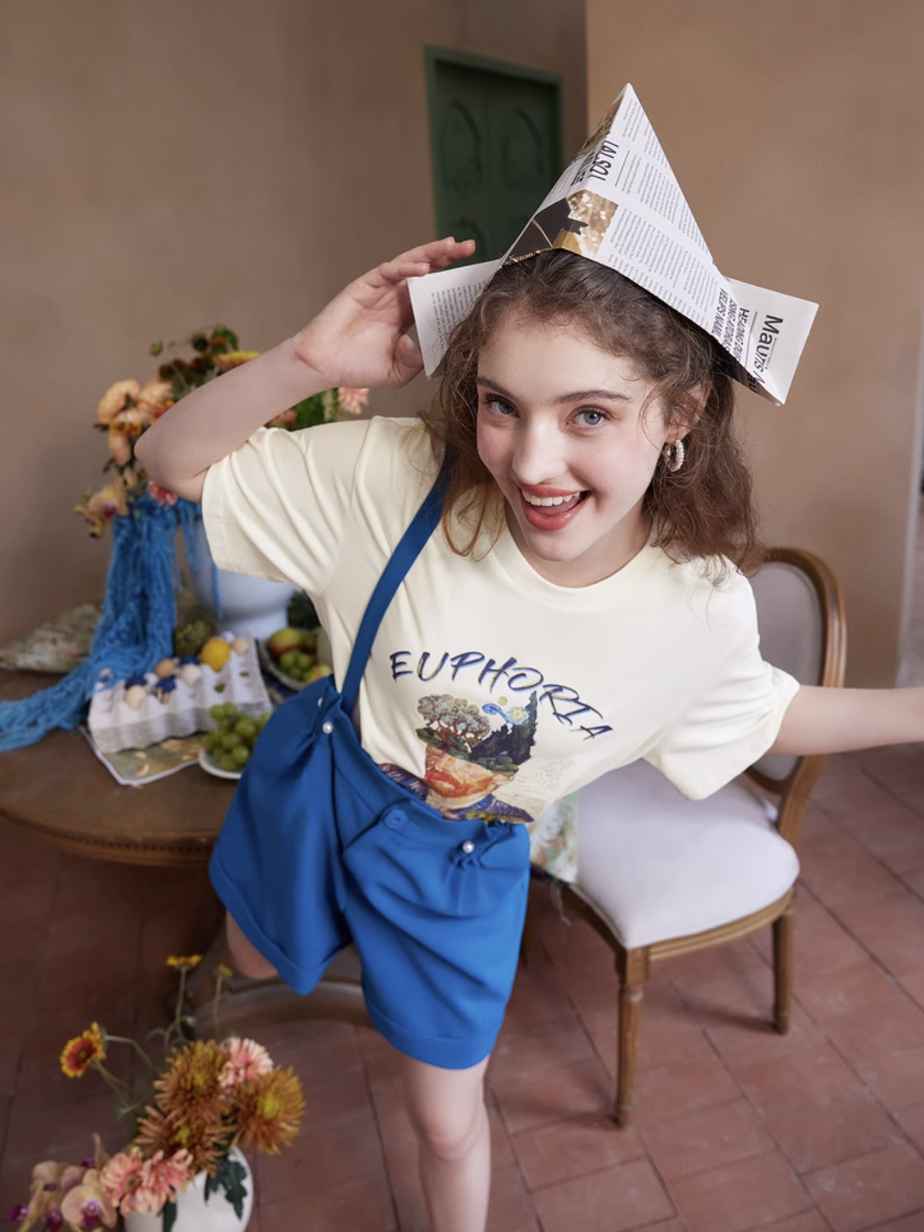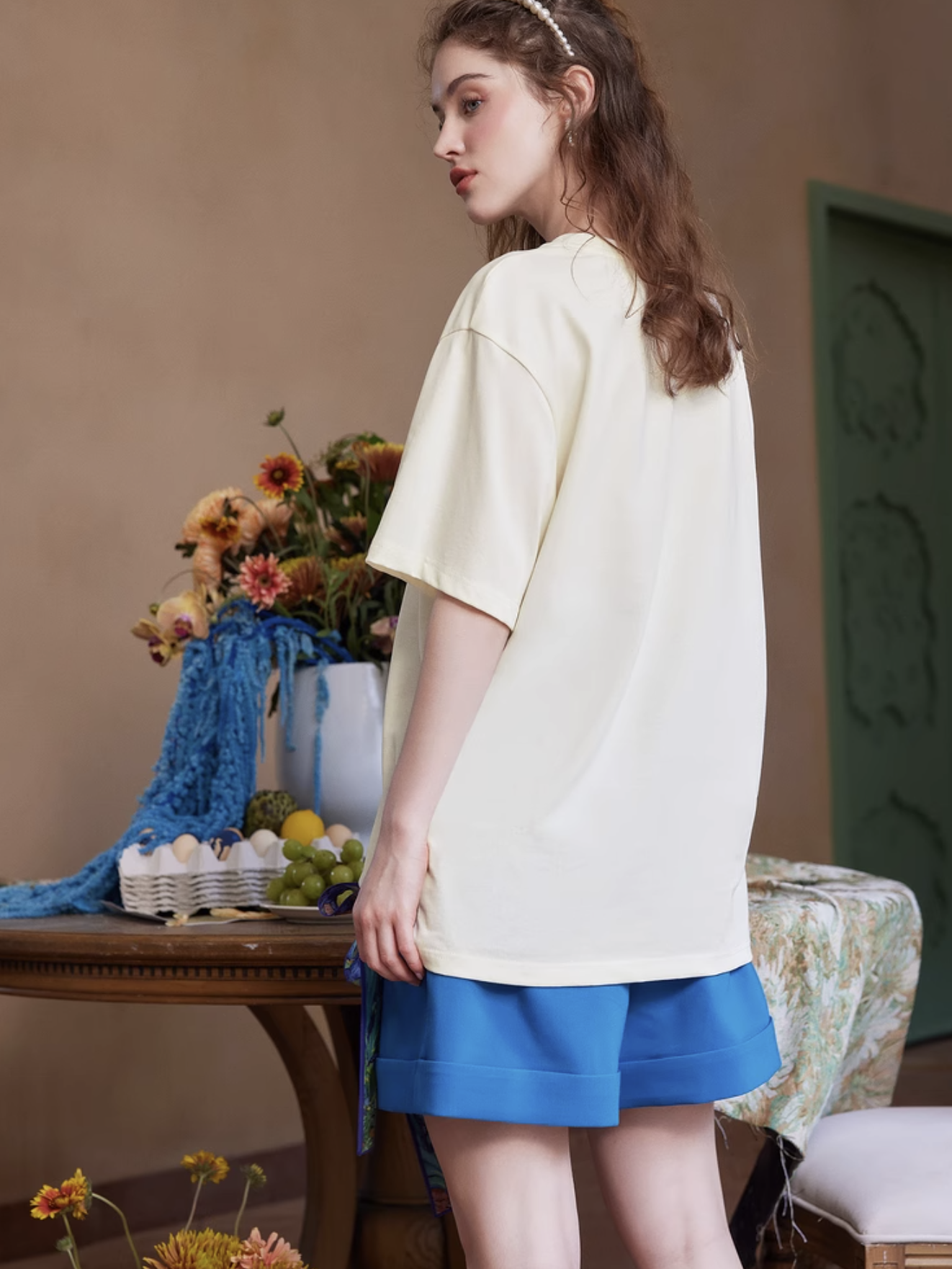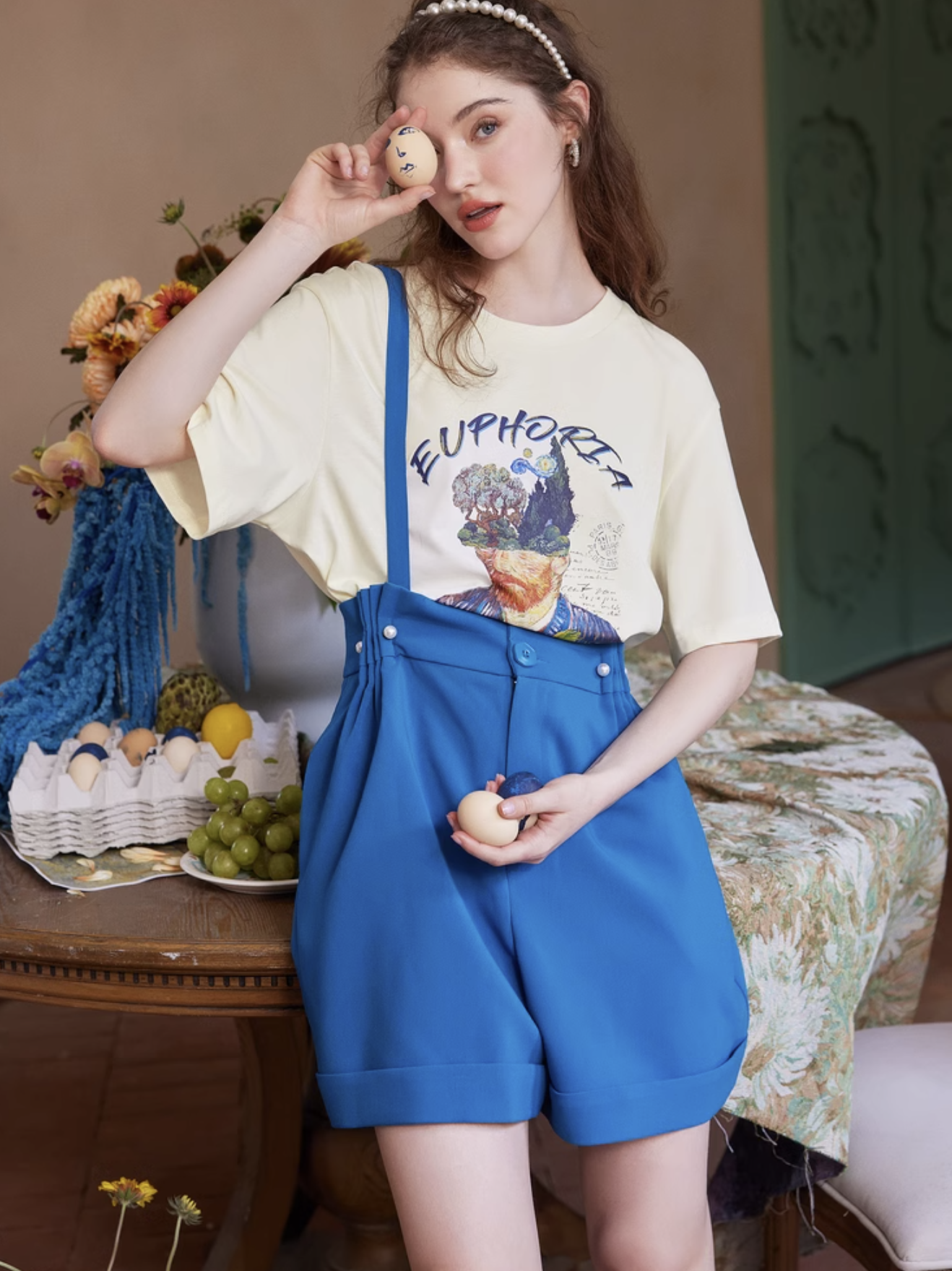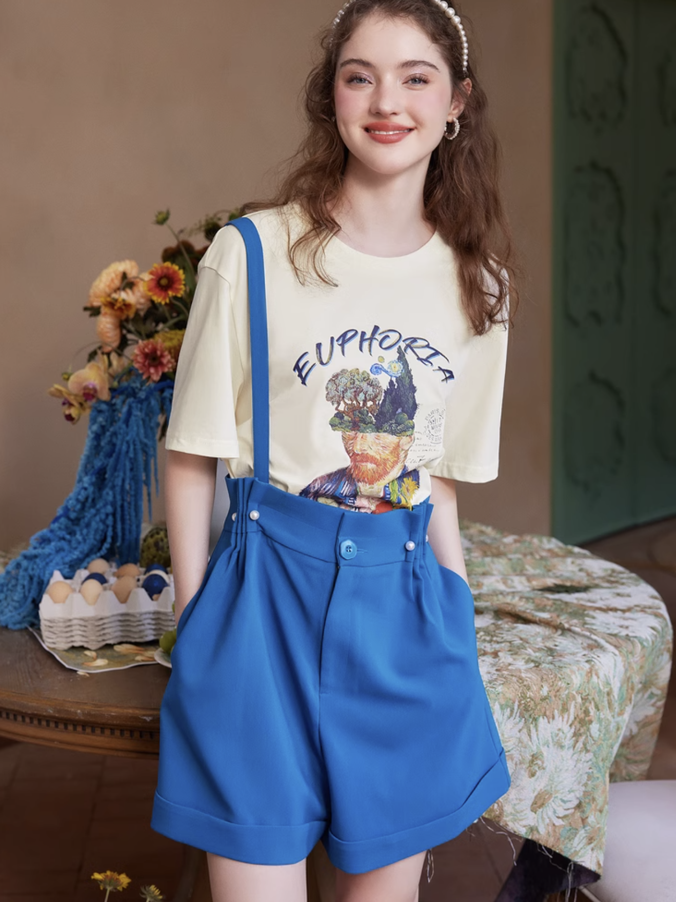 ゴッホの自画像と、ゴッホが描いた美しき花々や、群青色の星月夜を組み合わせたコラージュTシャツ。