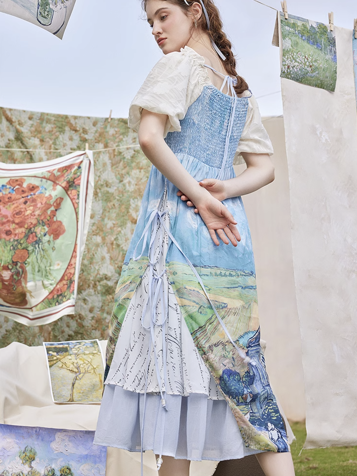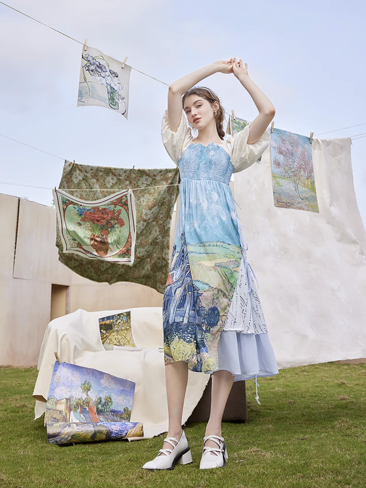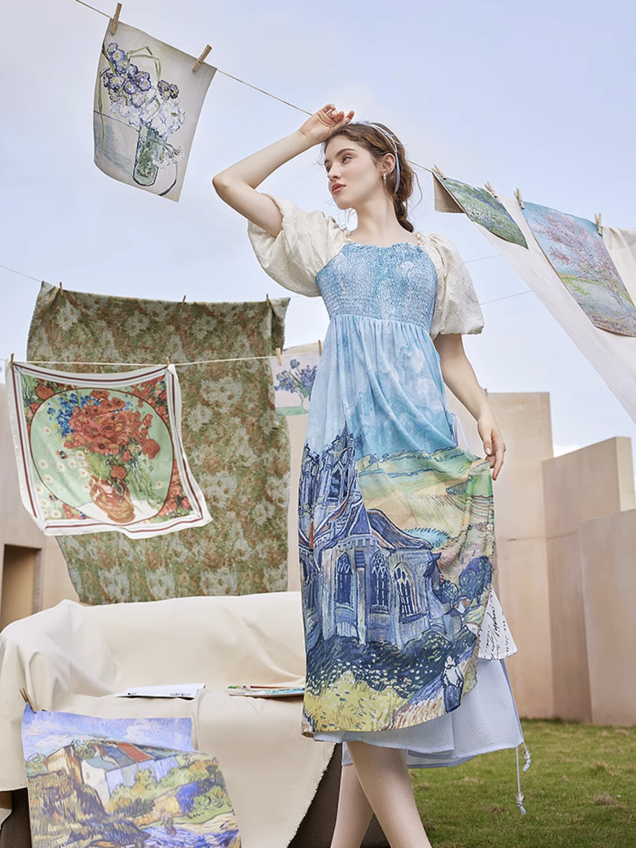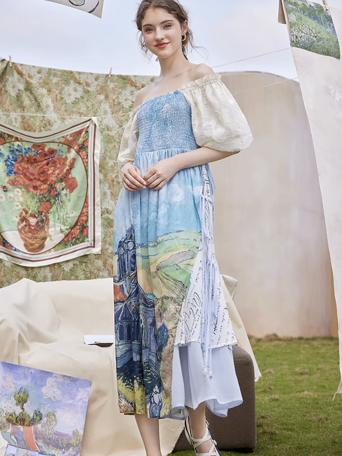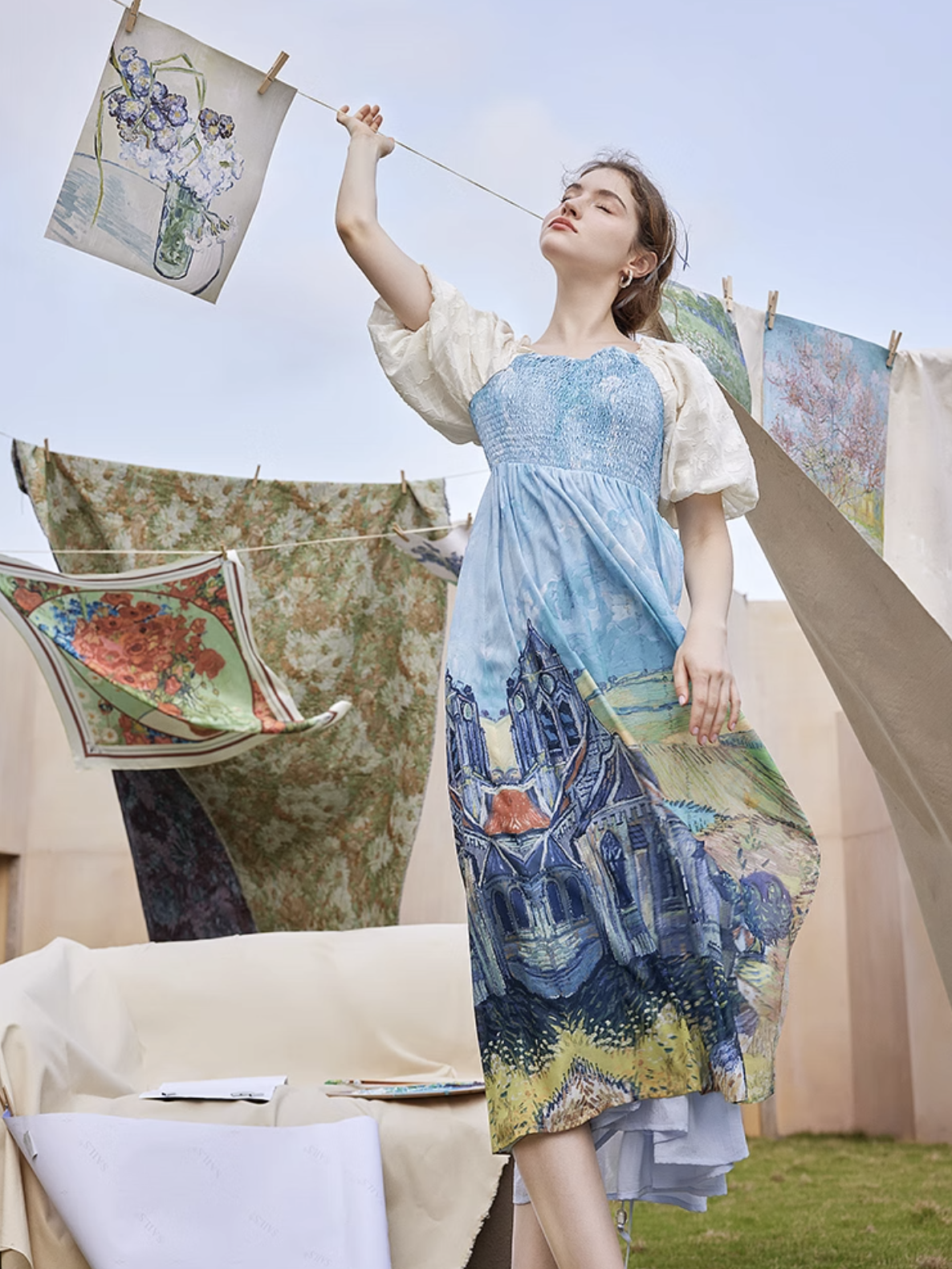 ゴッホの『オーヴェルの教会』と『アイリスの花』を大胆に描いたワンピース。