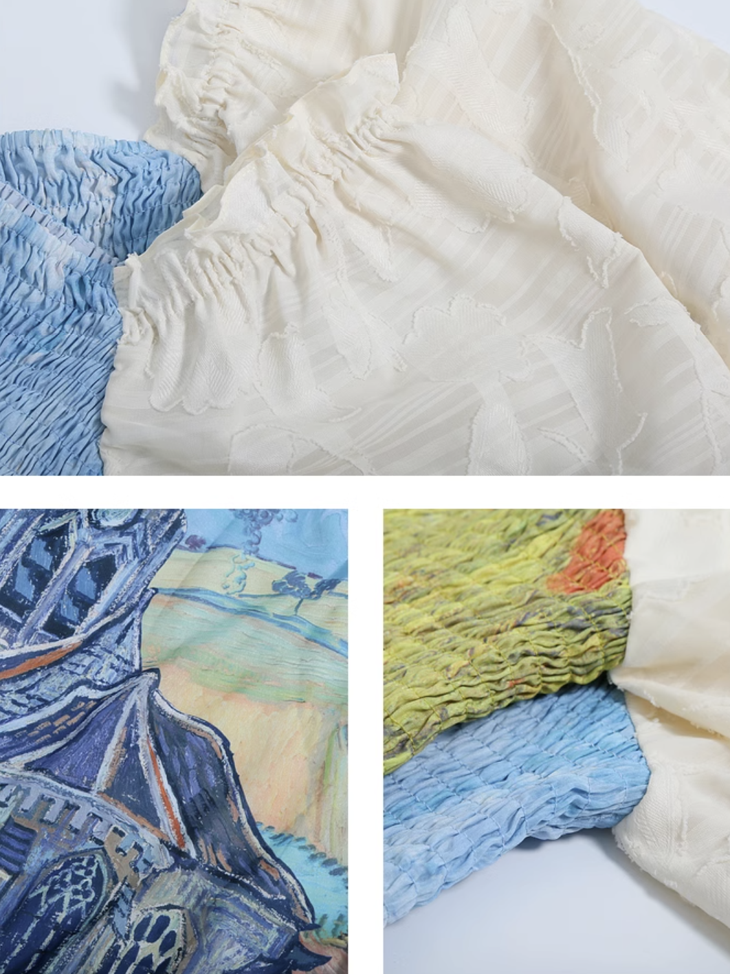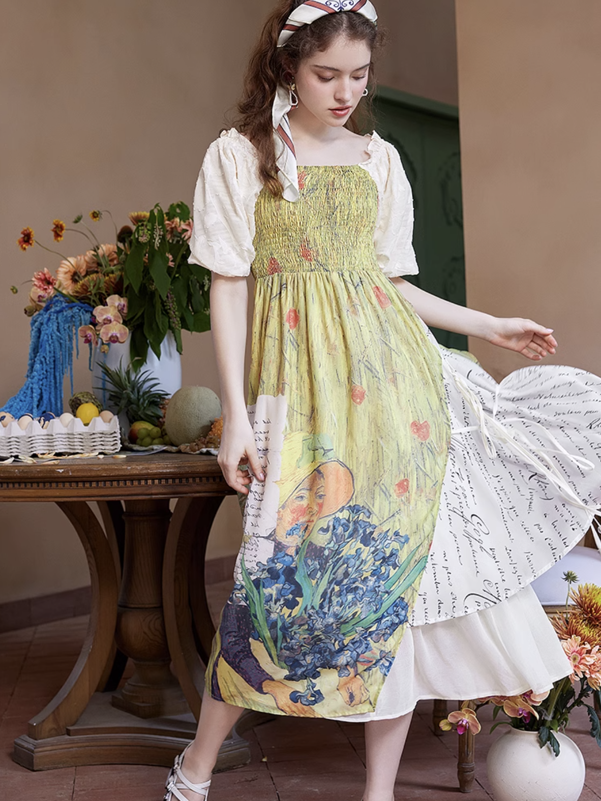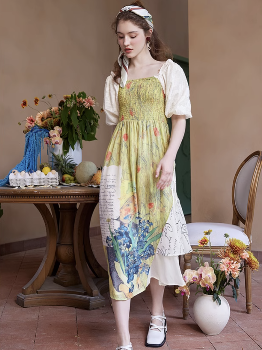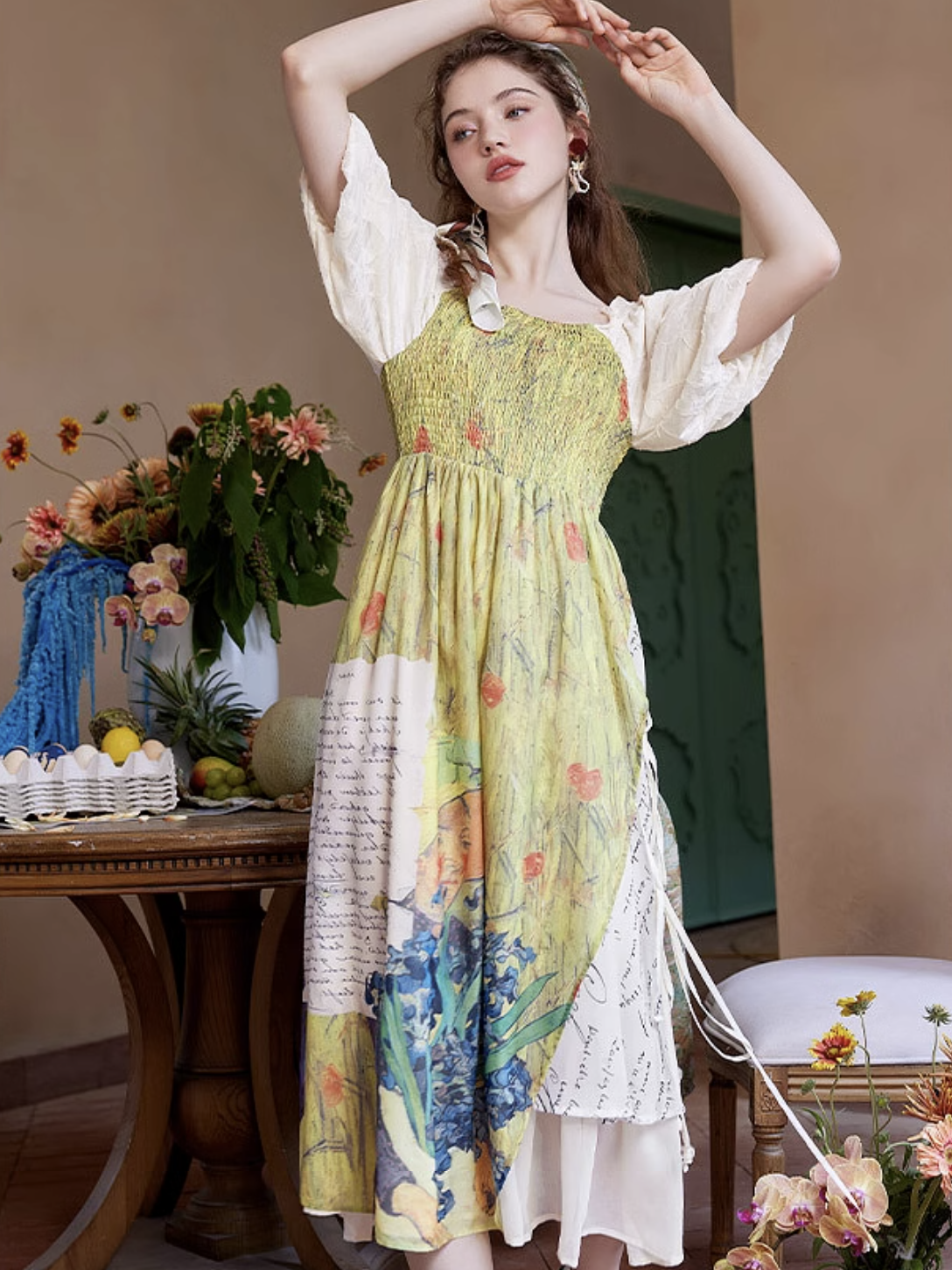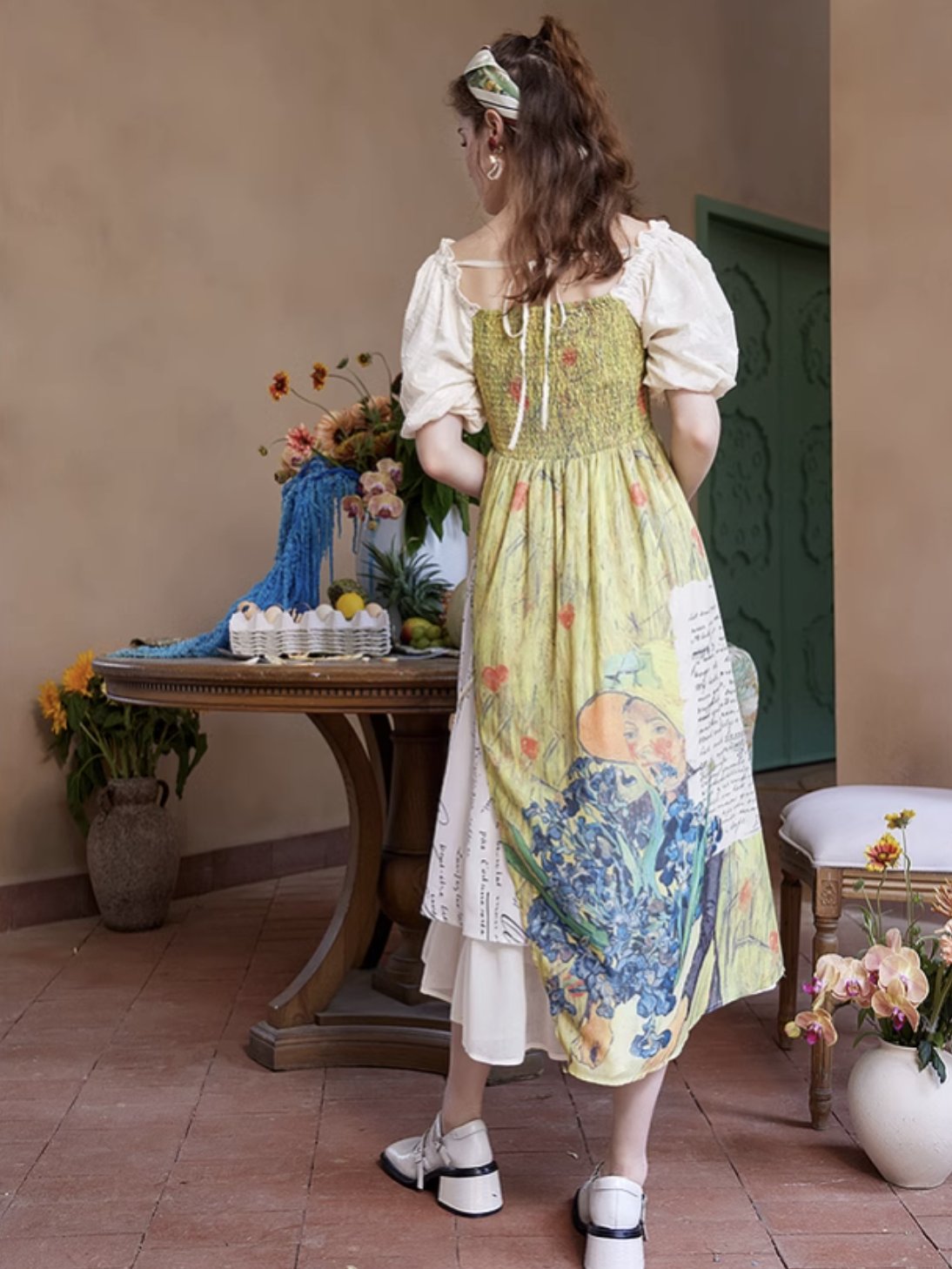 ゴッホの『オーヴェルの教会』と『アイリスの花』を大胆に描いたワンピース。