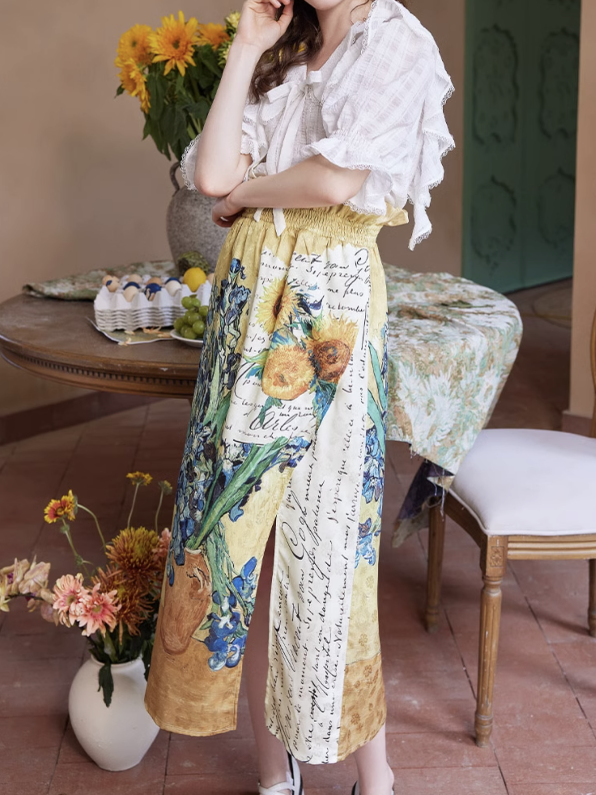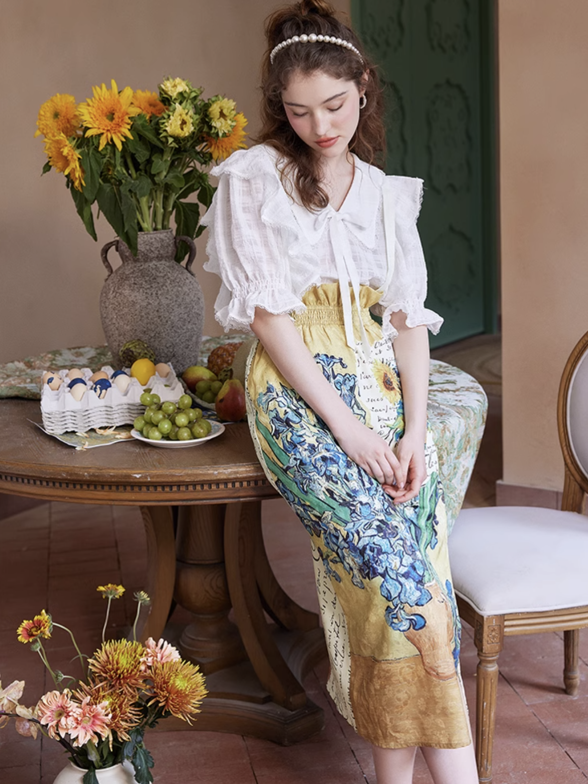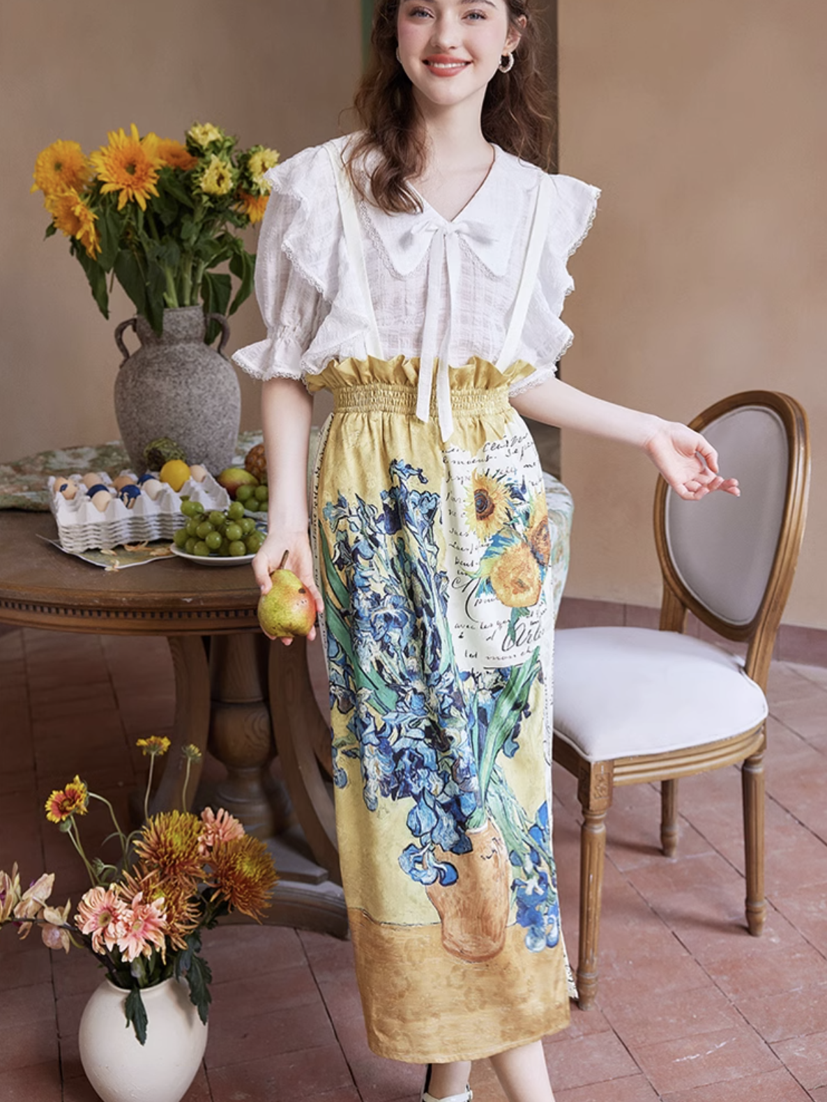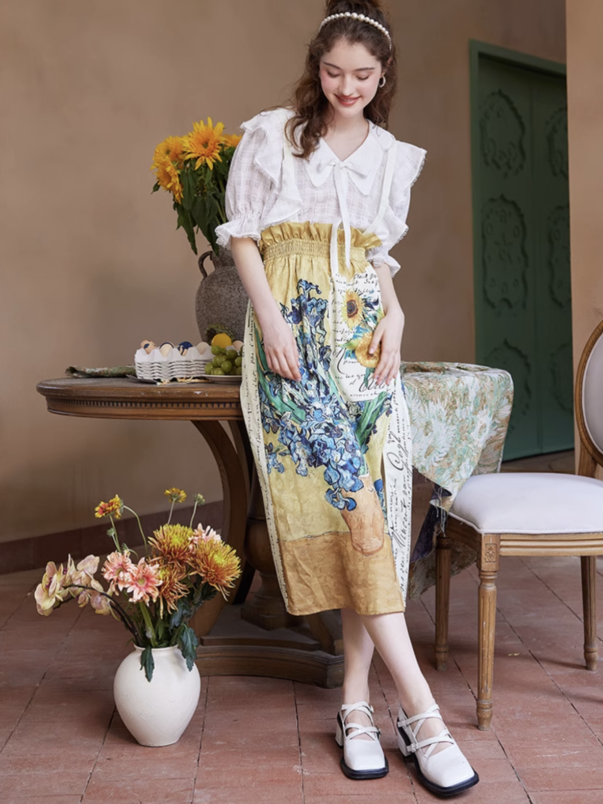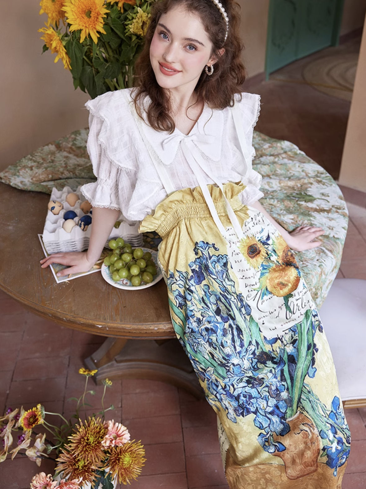 ゴッホの『アイリスのある花瓶』を大胆に描いたストラップスカート。