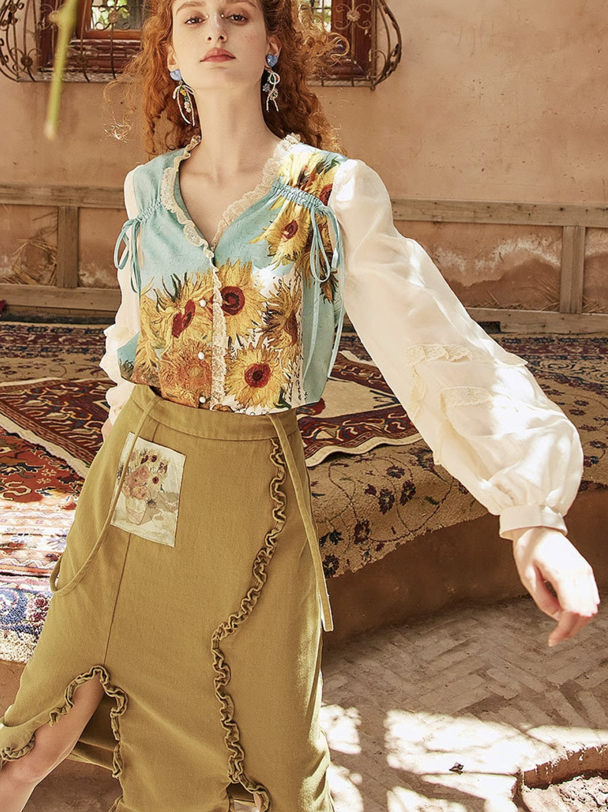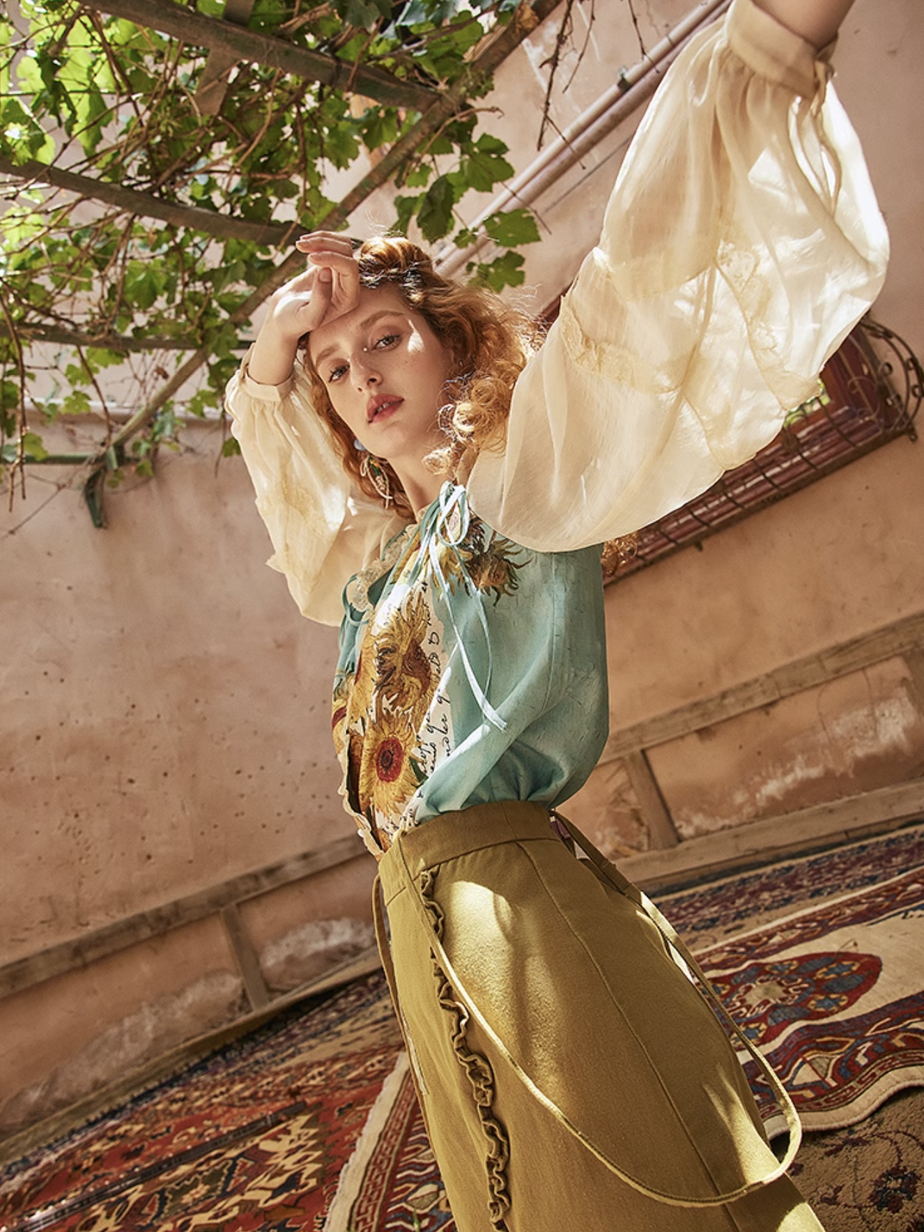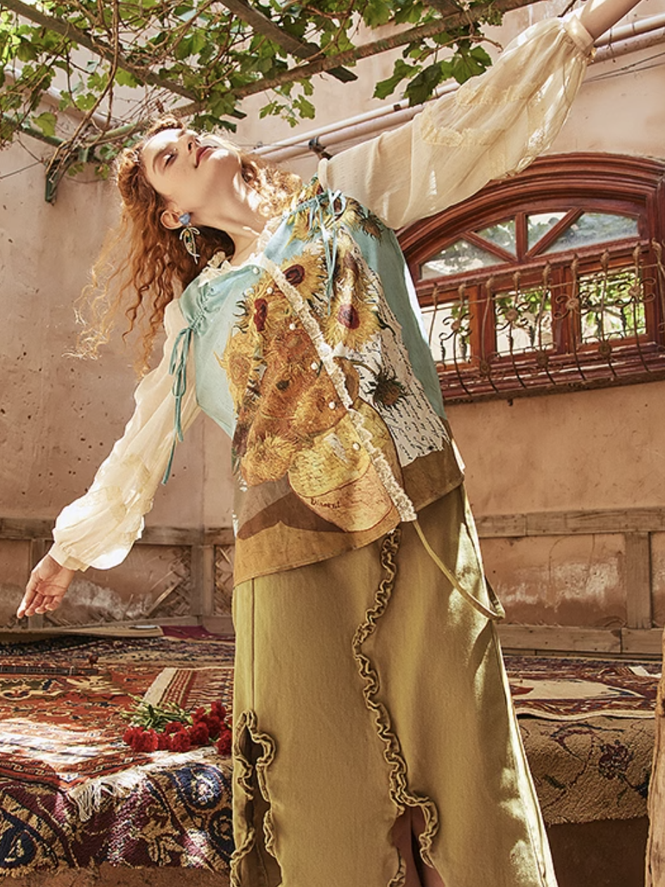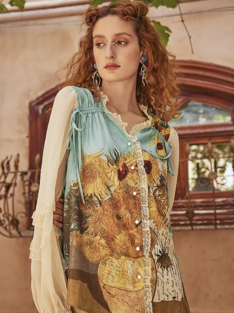 ゴッホの『花瓶の向日葵』と『アイリスのある花瓶』を大胆に描いたシフォンブラウス。