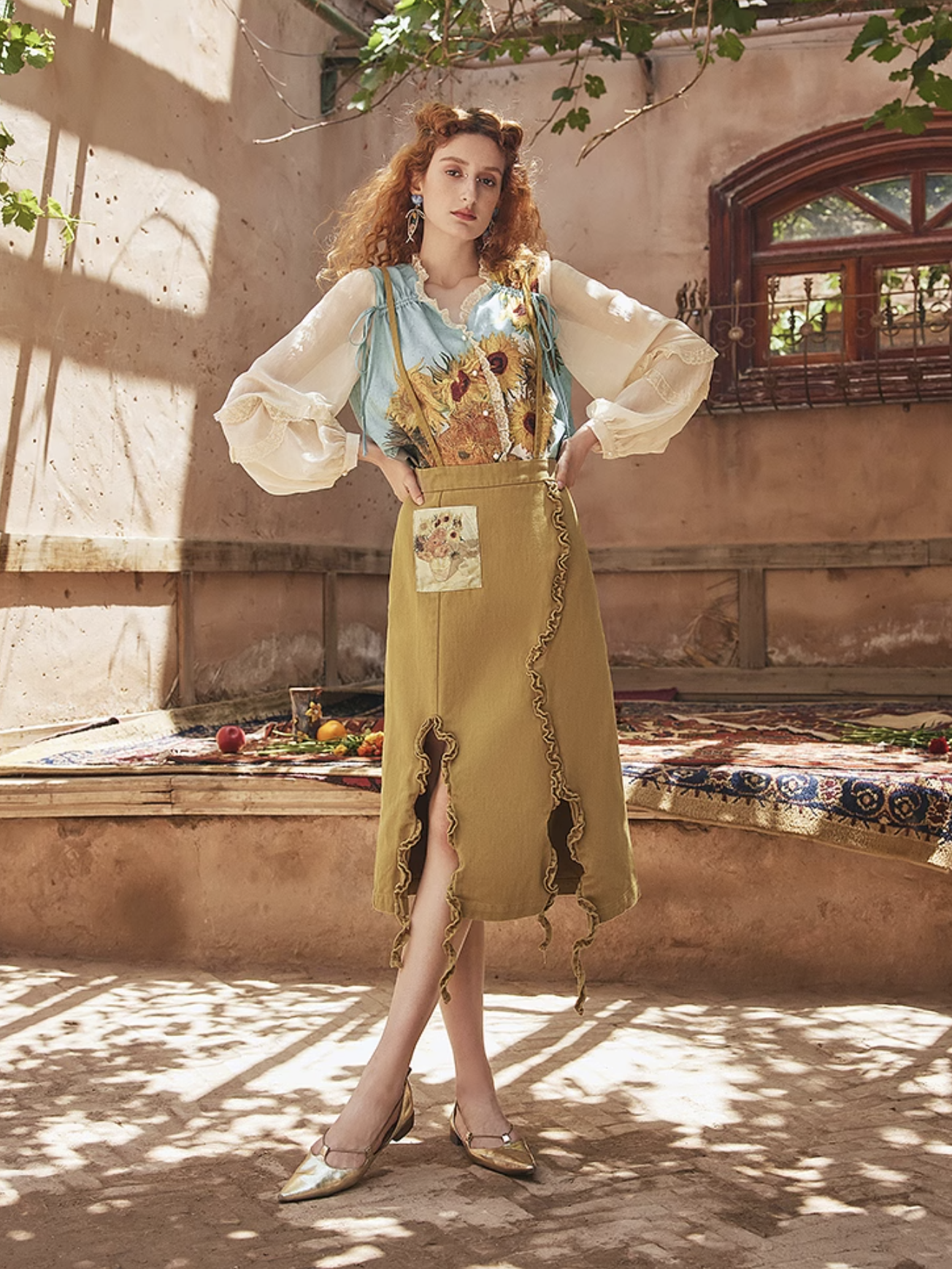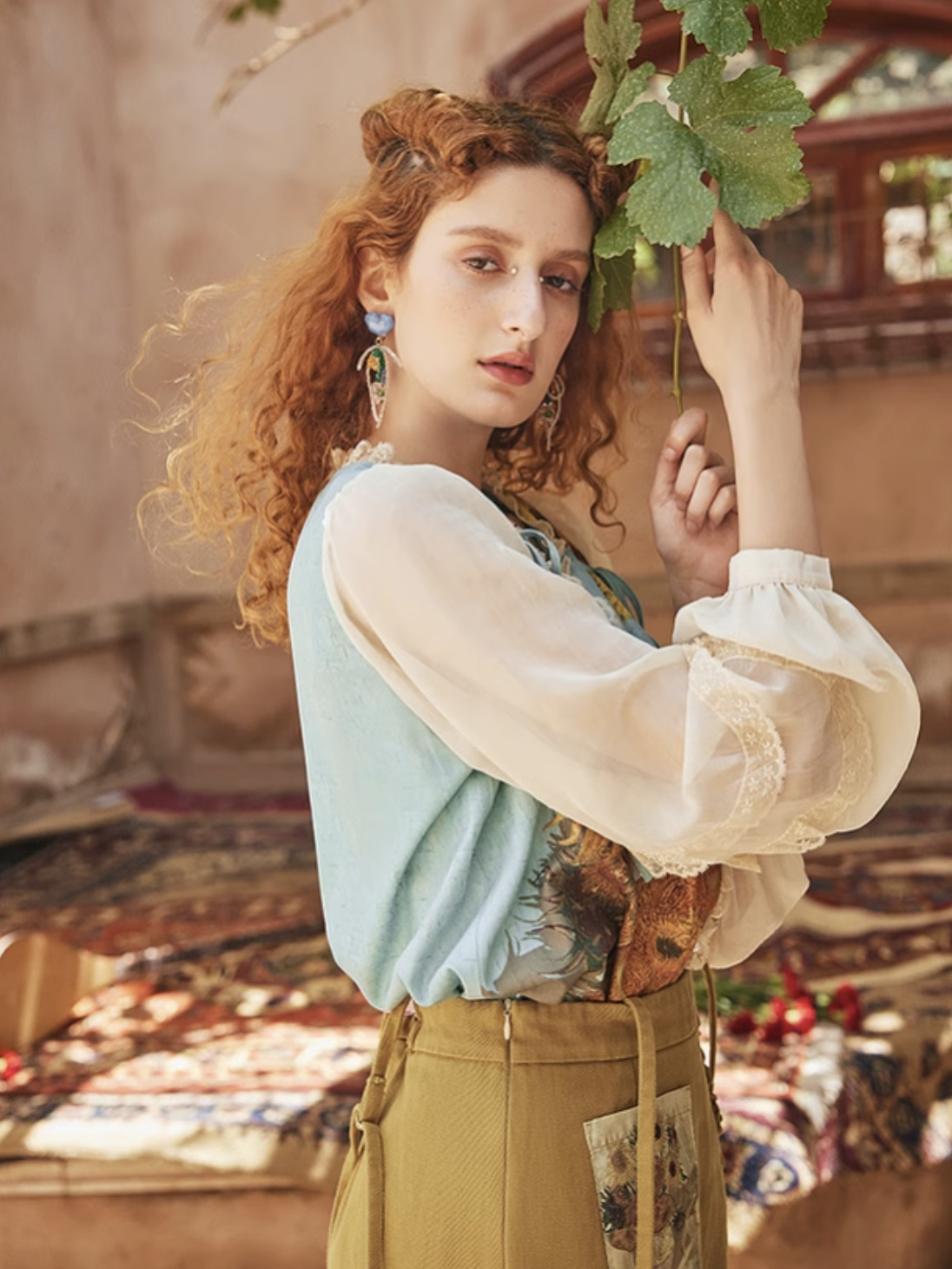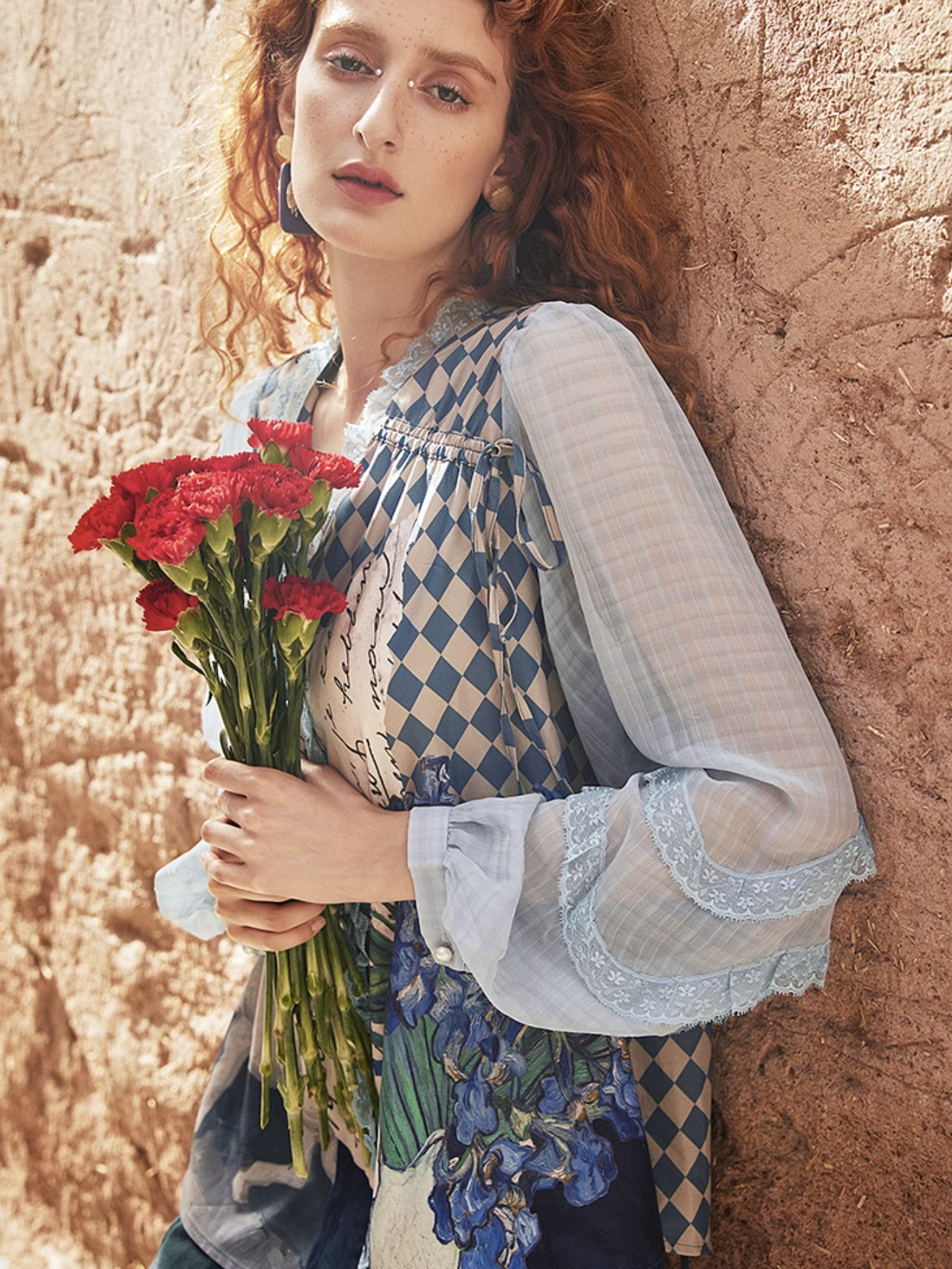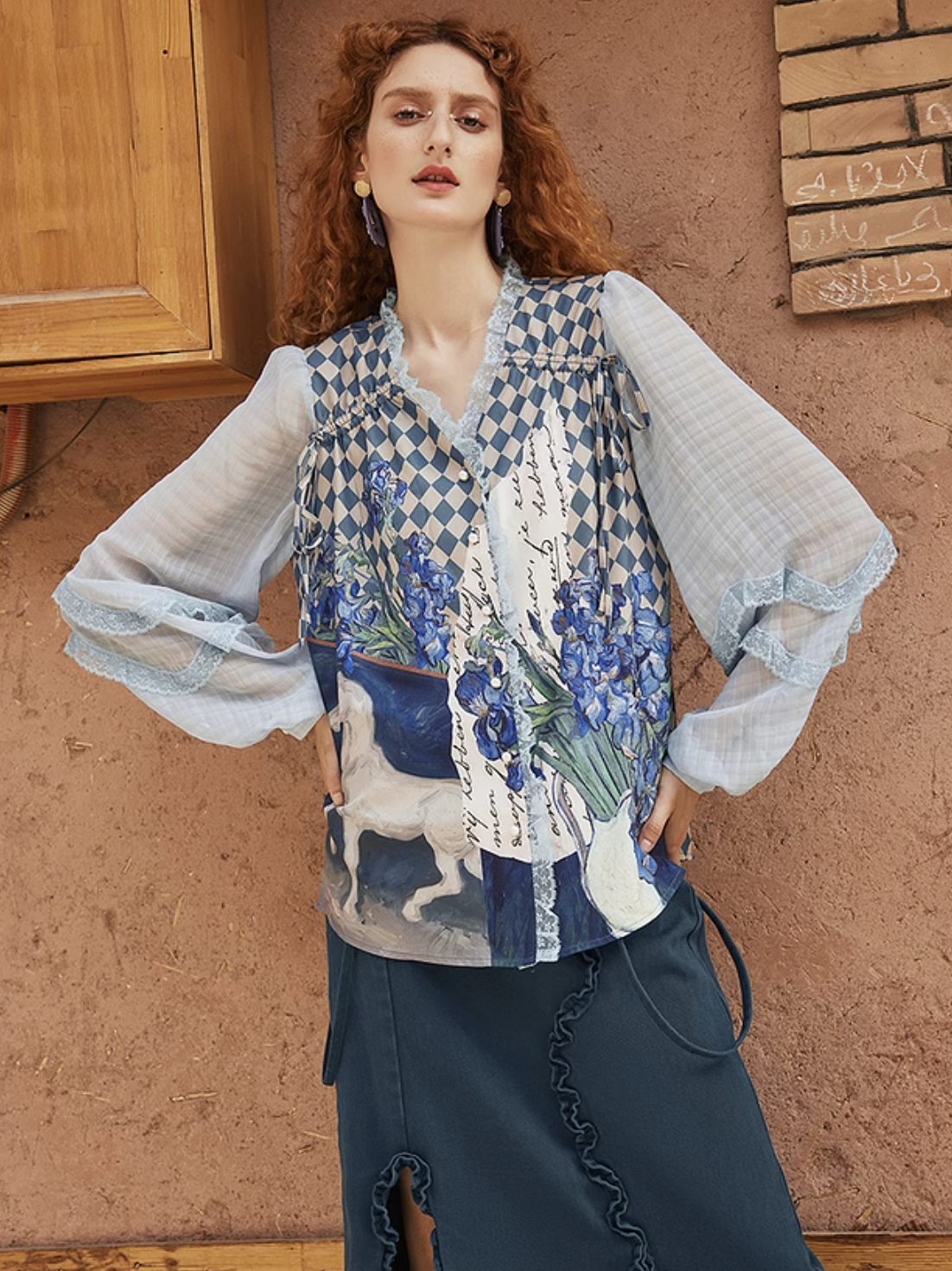 ゴッホの『花瓶の向日葵』と『アイリスのある花瓶』を大胆に描いたシフォンブラウス。