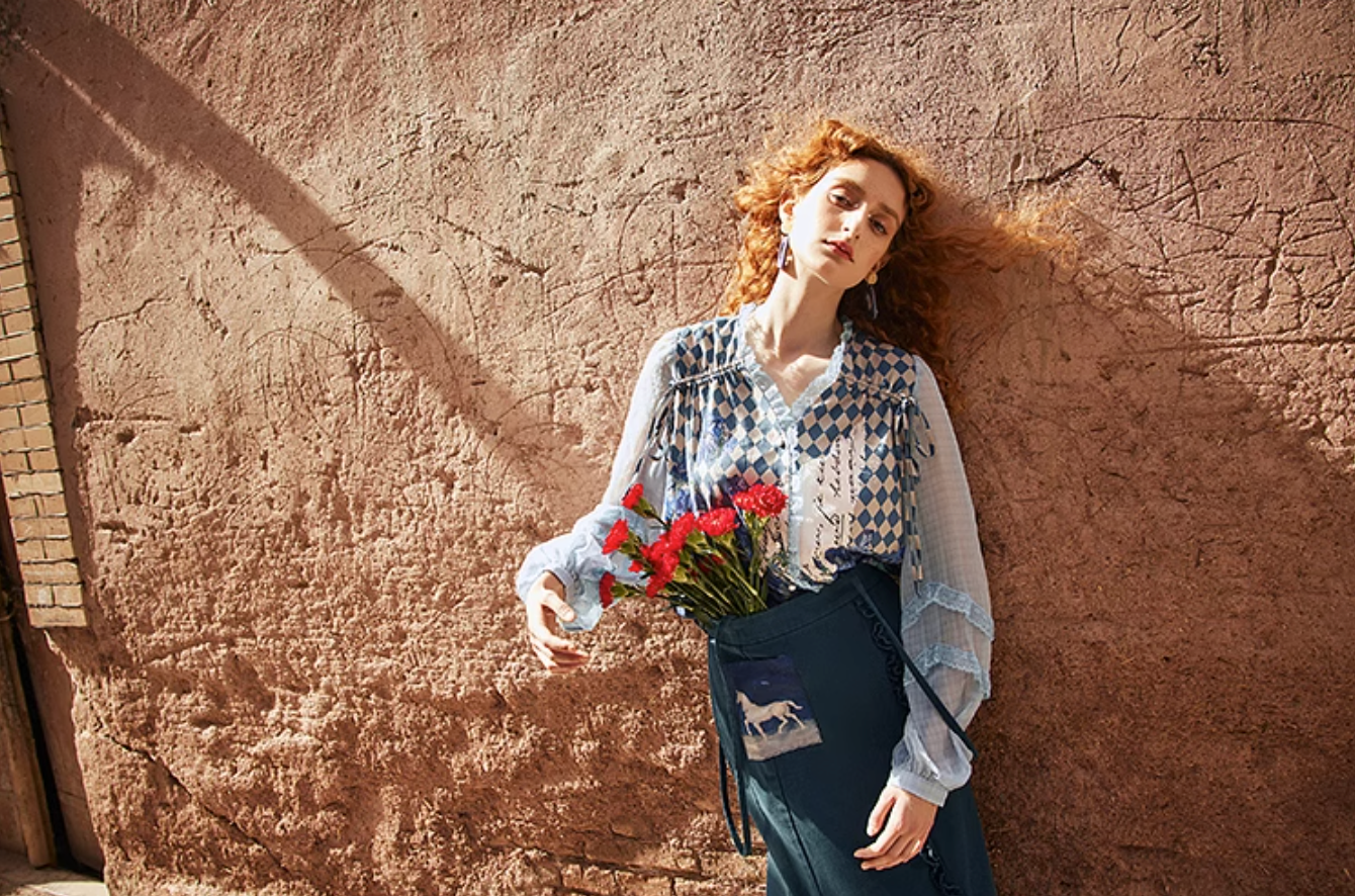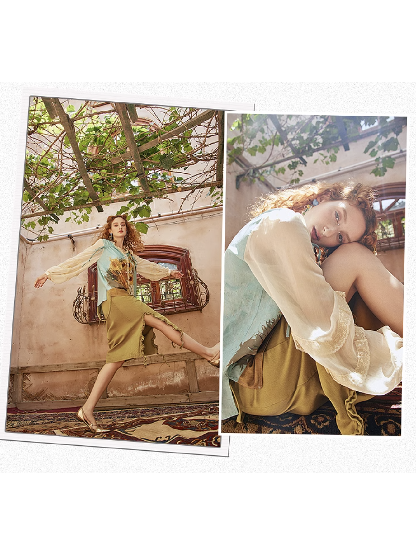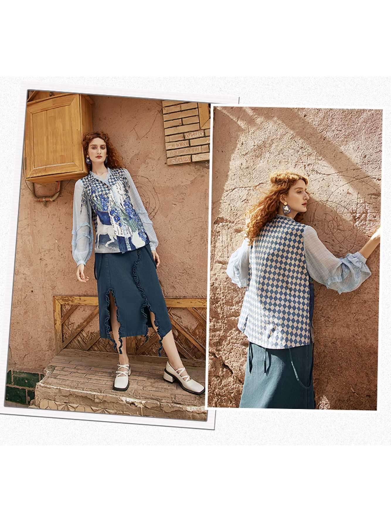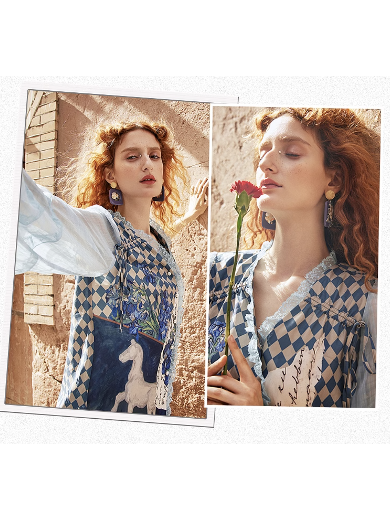 ゴッホの『花瓶の向日葵』と『アイリスのある花瓶』を大胆に描いたシフォンブラウス。